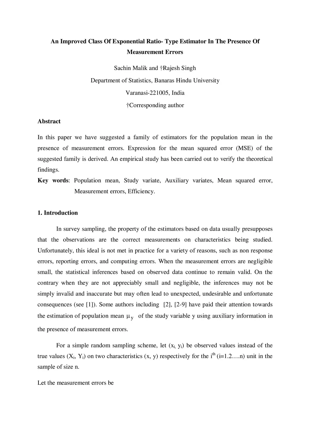 In this paper we have suggested a family of estimators for the population mean in the presence of measurement errors. Expression for the mean squared error (MSE) of the suggested family is derived. An empirical study has been carried out to verify the theoretical findings.