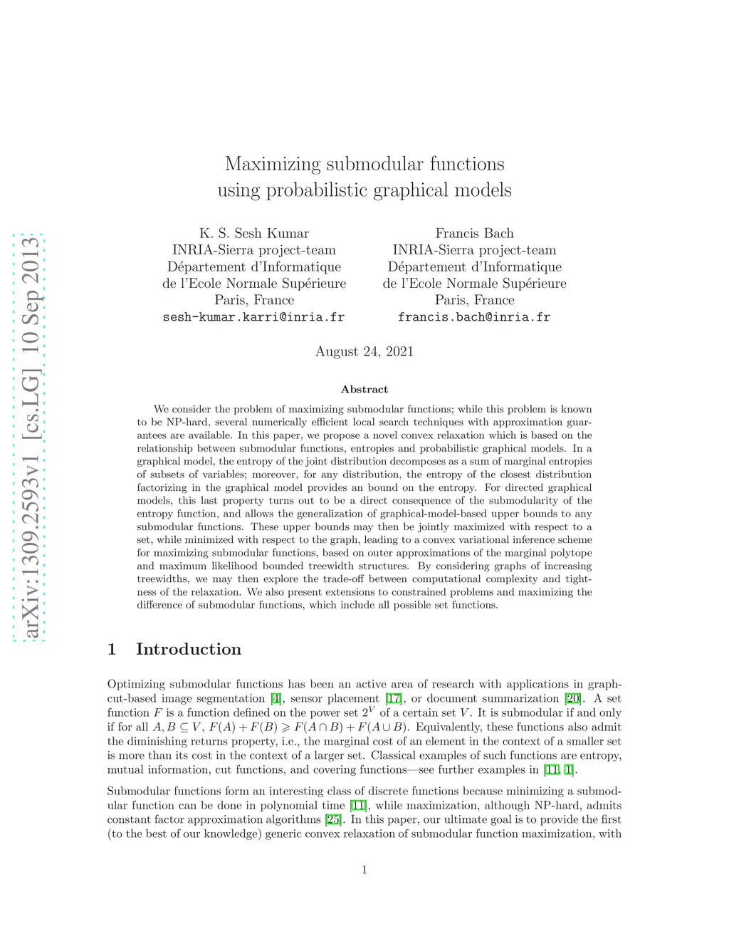 We consider the problem of maximizing submodular functions; while this problem is known to be NP-hard, several numerically efficient local search techniques with approximation guarantees are available. In this paper, we propose a novel convex relaxation which is based on the relationship between submodular functions, entropies and probabilistic graphical models. In a graphical model, the entropy of the joint distribution decomposes as a sum of marginal entropies of subsets of variables; moreover, for any distribution, the entropy of the closest distribution factorizing in the graphical model provides an bound on the entropy. For directed graphical models, this last property turns out to be a direct consequence of the submodularity of the entropy function, and allows the generalization of graphical-model-based upper bounds to any submodular functions. These upper bounds may then be jointly maximized with respect to a set, while minimized with respect to the graph, leading to a convex variational inference scheme for maximizing submodular functions, based on outer approximations of the marginal polytope and maximum likelihood bounded treewidth structures. By considering graphs of increasing treewidths, we may then explore the trade-off between computational complexity and tightness of the relaxation. We also present extensions to constrained problems and maximizing the difference of submodular functions, which include all possible set functions.