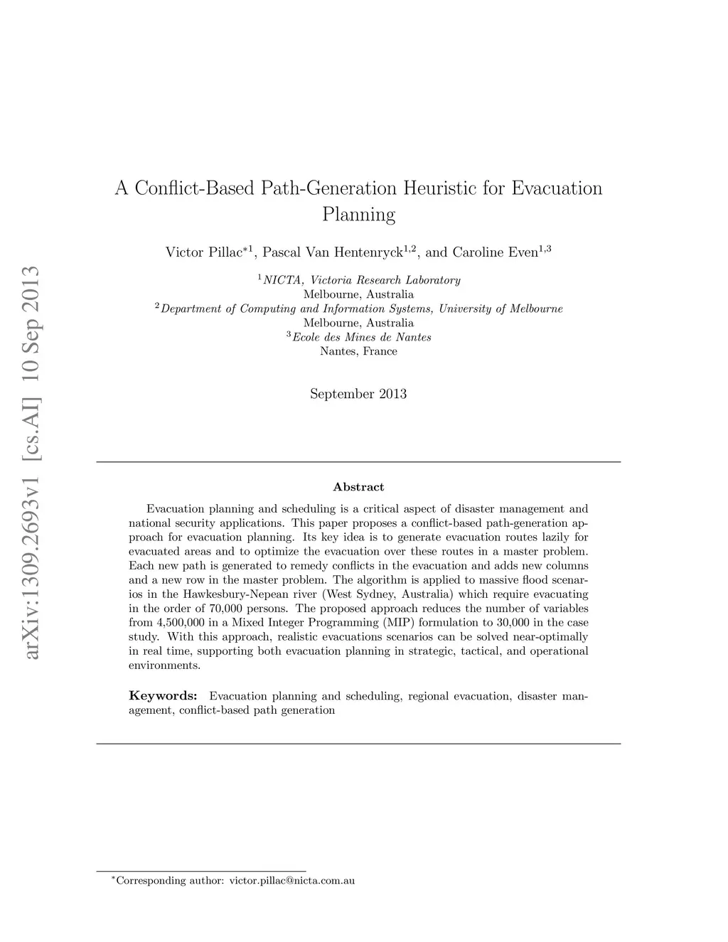 Evacuation planning and scheduling is a critical aspect of disaster management and national security applications. This paper proposes a conflict-based path-generation approach for evacuation planning. Its key idea is to generate evacuation routes lazily for evacuated areas and to optimize the evacuation over these routes in a master problem. Each new path is generated to remedy conflicts in the evacuation and adds new columns and a new row in the master problem. The algorithm is applied to massive flood scenarios in the Hawkesbury-Nepean river (West Sydney, Australia) which require evacuating in the order of 70,000 persons. The proposed approach reduces the number of variables from 4,500,000 in a Mixed Integer Programming (MIP) formulation to 30,000 in the case study. With this approach, realistic evacuations scenarios can be solved near-optimally in real time, supporting both evacuation planning in strategic, tactical, and operational environments.