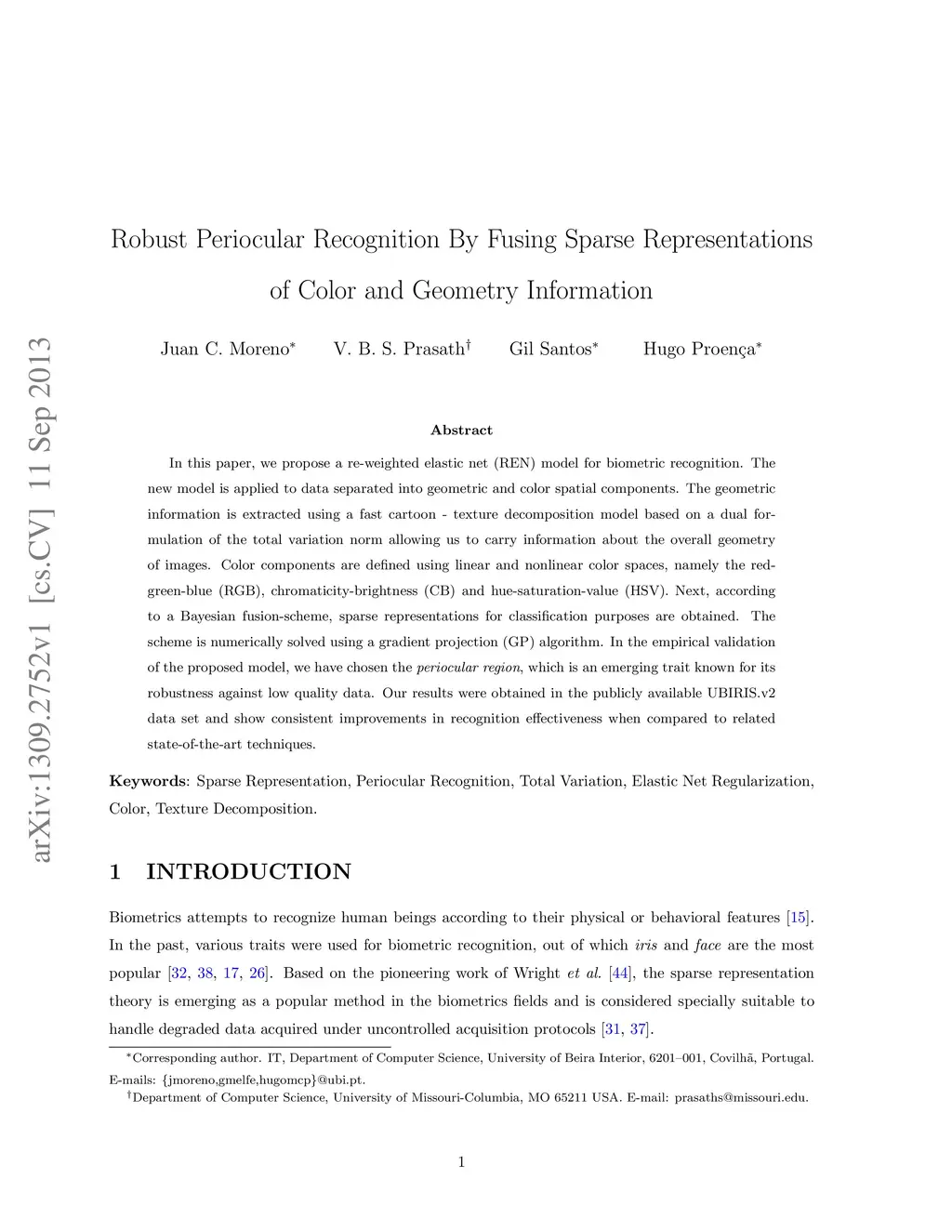 In this paper, we propose a re-weighted elastic net (REN) model for biometric recognition. The new model is applied to data separated into geometric and color spatial components. The geometric information is extracted using a fast cartoon - texture decomposition model based on a dual formulation of the total variation norm allowing us to carry information about the overall geometry of images. Color components are defined using linear and nonlinear color spaces, namely the red-green-blue (RGB), chromaticity-brightness (CB) and hue-saturation-value (HSV). Next, according to a Bayesian fusion-scheme, sparse representations for classification purposes are obtained. The scheme is numerically solved using a gradient projection (GP) algorithm. In the empirical validation of the proposed model, we have chosen the periocular region, which is an emerging trait known for its robustness against low quality data. Our results were obtained in the publicly available UBIRIS.v2 data set and show consistent improvements in recognition effectiveness when compared to related state-of-the-art techniques.