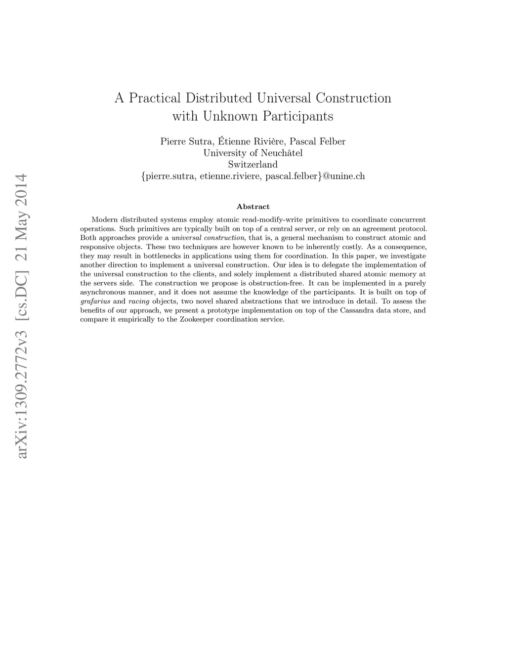 Modern distributed systems employ atomic read-modify-write primitives to coordinate concurrent operations. Such primitives are typically built on top of a central server, or rely on an agreement protocol. Both approaches provide a universal construction, that is, a general mechanism to construct atomic and responsive objects. These two techniques are however known to be inherently costly. As a consequence, they may result in bottlenecks in applications using them for coordination. In this paper, we investigate another direction to implement a universal construction. Our idea is to delegate the implementation of the universal construction to the clients, and solely implement a distributed shared atomic memory at the servers side. The construction we propose is obstruction-free. It can be implemented in a purely asynchronous manner, and it does not assume the knowledge of the participants. It is built on top of grafarius and racing objects, two novel shared abstractions that we introduce in detail. To assess the benefits of our approach, we present a prototype implementation on top of the Cassandra data store, and compare it empirically to the Zookeeper coordination service.
