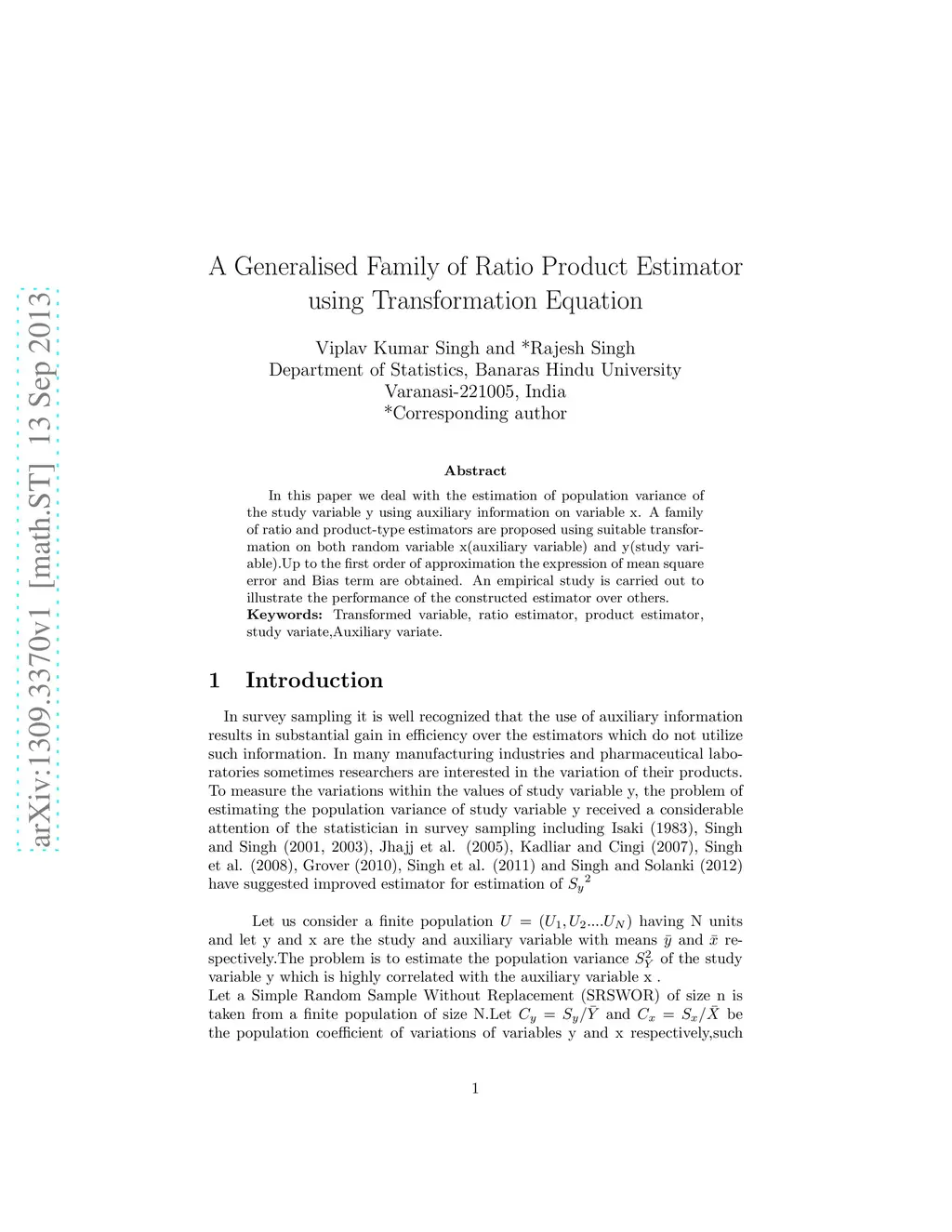 A generalised family of ratio product estimator using transformation
