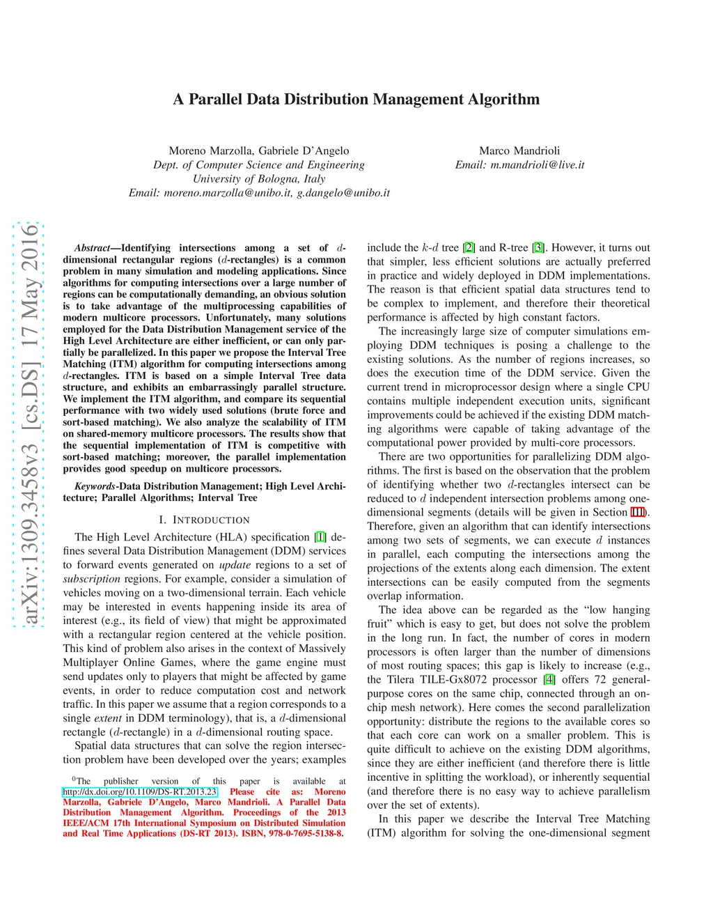 Identifying intersections among a set of d-dimensional rectangular regions (d-rectangles) is a common problem in many simulation and modeling applications. Since algorithms for computing intersections over a large number of regions can be computationally demanding, an obvious solution is to take advantage of the multiprocessing capabilities of modern multicore processors. Unfortunately, many solutions employed for the Data Distribution Management service of the High Level Architecture are either inefficient, or can only partially be parallelized. In this paper we propose the Interval Tree Matching (ITM) algorithm for computing intersections among d-rectangles. ITM is based on a simple Interval Tree data structure, and exhibits an embarrassingly parallel structure. We implement the ITM algorithm, and compare its sequential performance with two widely used solutions (brute force and sort-based matching). We also analyze the scalability of ITM on shared-memory multicore processors. The results show that the sequential implementation of ITM is competitive with sort-based matching; moreover, the parallel implementation provides good speedup on multicore processors.