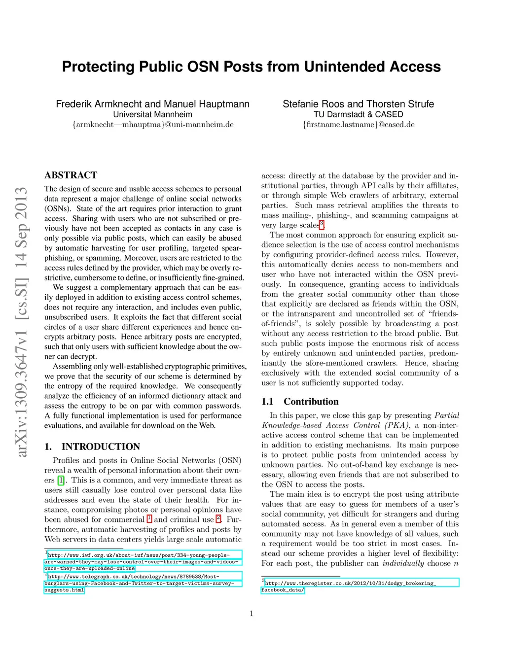 The design of secure and usable access schemes to personal data represent a major challenge of online social networks (OSNs). State of the art requires prior interaction to grant access. Sharing with users who are not subscribed or previously have not been accepted as contacts in any case is only possible via public posts, which can easily be abused by automatic harvesting for user profiling, targeted spear-phishing, or spamming. Moreover, users are restricted to the access rules defined by the provider, which may be overly restrictive, cumbersome to define, or insufficiently fine-grained. We suggest a complementary approach that can be easily deployed in addition to existing access control schemes, does not require any interaction, and includes even public, unsubscribed users. It exploits the fact that different social circles of a user share different experiences and hence encrypts arbitrary posts. Hence arbitrary posts are encrypted, such that only users with sufficient knowledge about the owner can decrypt. Assembling only well-established cryptographic primitives, we prove that the security of our scheme is determined by the entropy of the required knowledge. We consequently analyze the efficiency of an informed dictionary attack and assess the entropy to be on par with common passwords. A fully functional implementation is used for performance evaluations, and available for download on the Web.