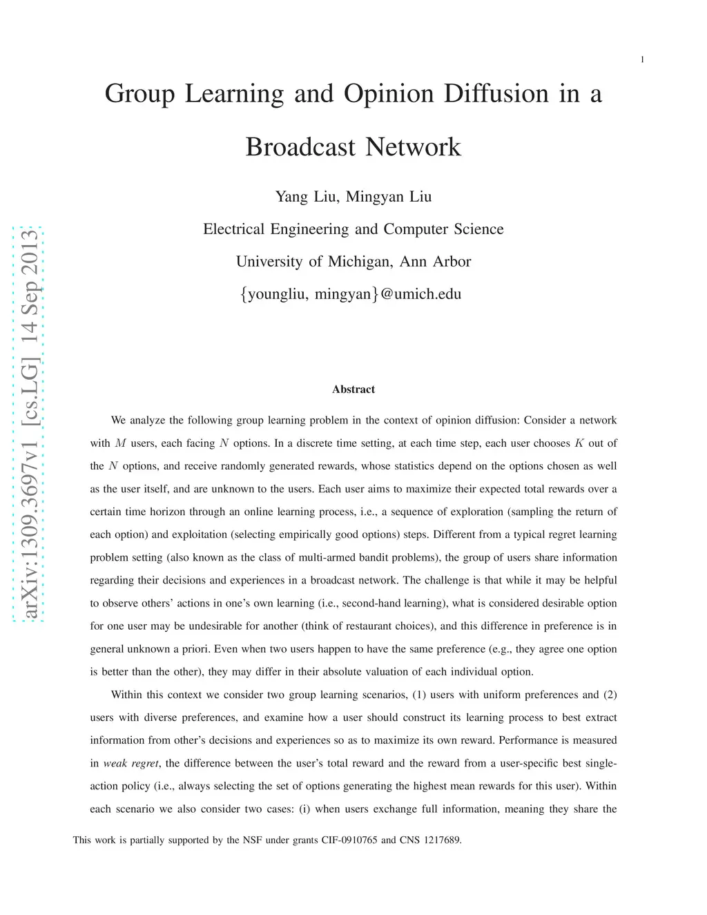 We analyze the following group learning problem in the context of opinion diffusion: Consider a network with users, each facing options. In a discrete time setting, at each time step, each user chooses out of the options, and receive randomly generated rewards, whose statistics depend on the options chosen as well as the user itself, and are unknown to the users. Each user aims to maximize their expected total rewards over a certain time horizon through an online learning process, i.e., a sequence of exploration (sampling the return of each option) and exploitation (selecting empirically good options) steps. Within this context we consider two group learning scenarios, (1) users with uniform preferences and (2) users with diverse preferences, and examine how a user should construct its learning process to best extract information from other's decisions and experiences so as to maximize its own reward. Performance is measured in {\em weak regret}, the difference between the user's total reward and the reward from a user-specific best single-action policy (i.e., always selecting the set of options generating the highest mean rewards for this user). Within each scenario we also consider two cases: (i) when users exchange full information, meaning they share the actual rewards they obtained from their choices, and (ii) when users exchange limited information, e.g., only their choices but not rewards obtained from these choices.