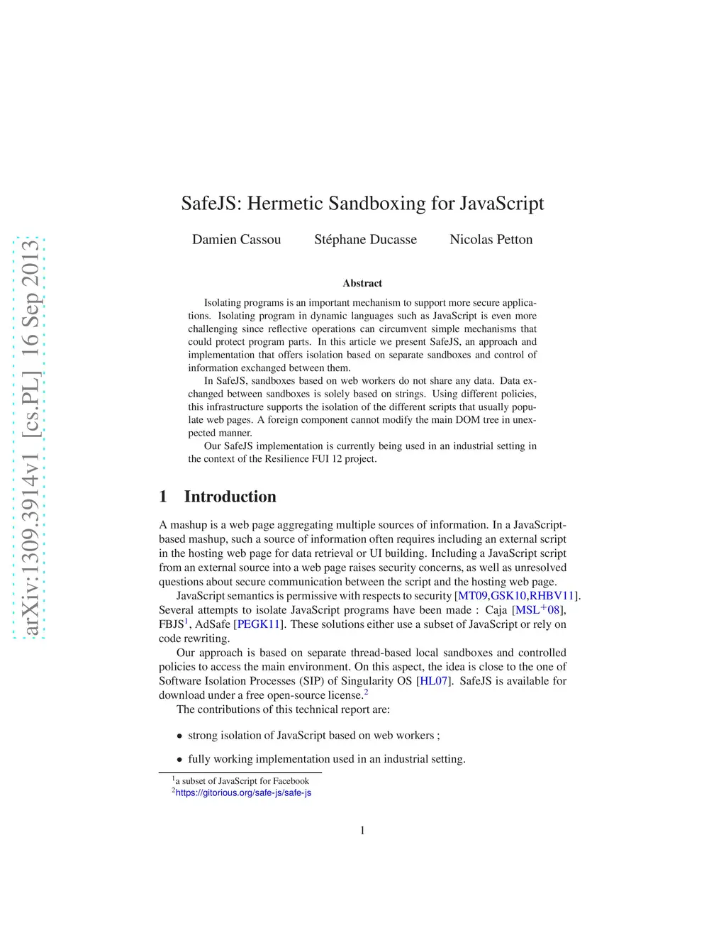 SafeJS: Hermetic Sandboxing for JavaScript