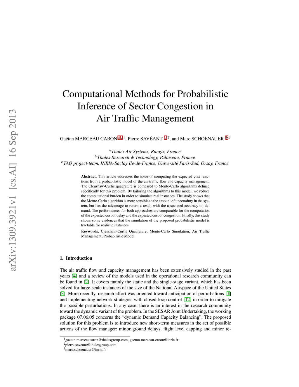 This article addresses the issue of computing the expected cost functions from a probabilistic model of the air traffic flow and capacity management. The Clenshaw-Curtis quadrature is compared to Monte-Carlo algorithms defined specifically for this problem. By tailoring the algorithms to this model, we reduce the computational burden in order to simulate real instances. The study shows that the Monte-Carlo algorithm is more sensible to the amount of uncertainty in the system, but has the advantage to return a result with the associated accuracy on demand. The performances for both approaches are comparable for the computation of the expected cost of delay and the expected cost of congestion. Finally, this study shows some evidences that the simulation of the proposed probabilistic model is tractable for realistic instances.