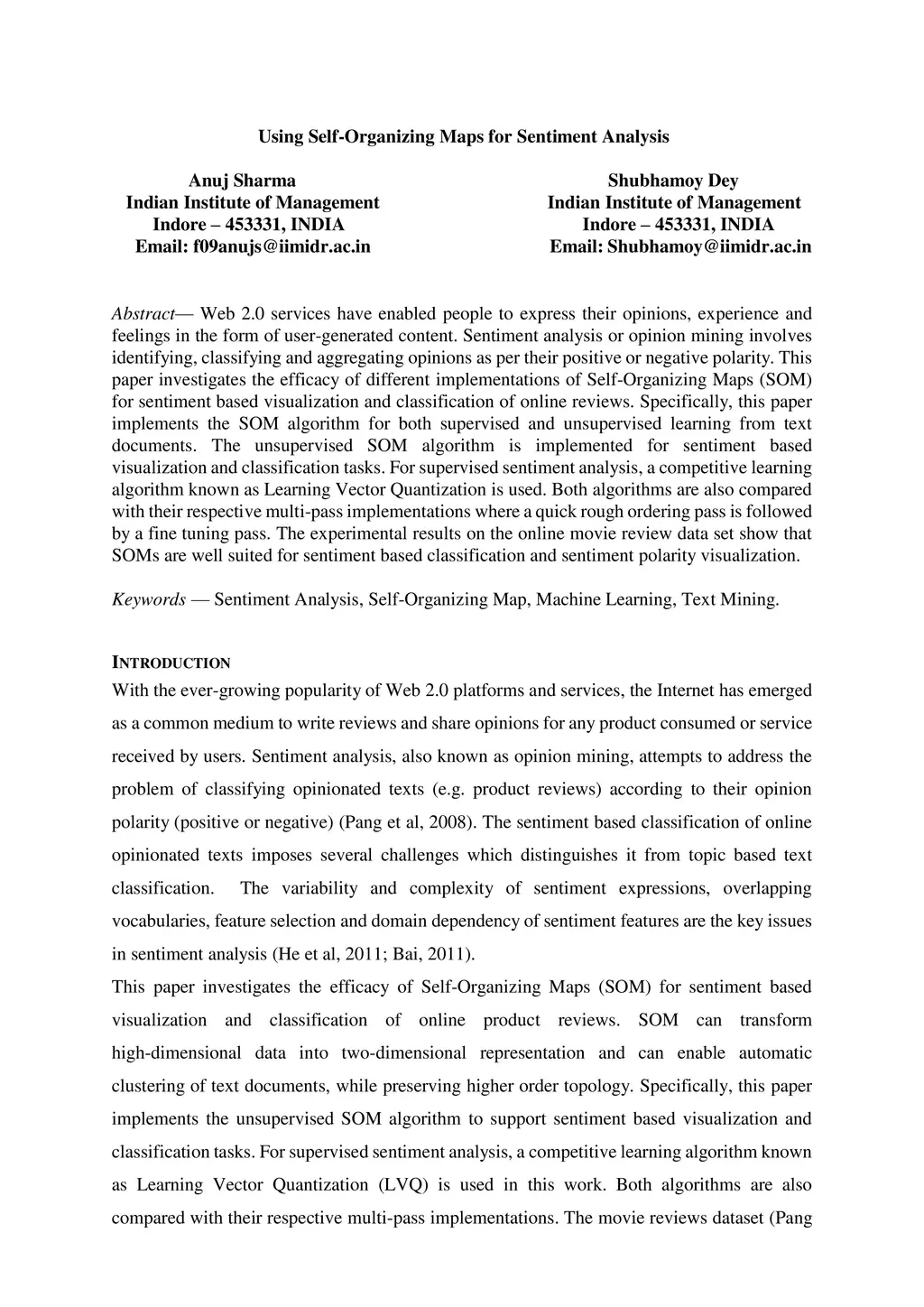 Web 2.0 services have enabled people to express their opinions, experience and feelings in the form of user-generated content. Sentiment analysis or opinion mining involves identifying, classifying and aggregating opinions as per their positive or negative polarity. This paper investigates the efficacy of different implementations of Self-Organizing Maps (SOM) for sentiment based visualization and classification of online reviews. Specifically, this paper implements the SOM algorithm for both supervised and unsupervised learning from text documents. The unsupervised SOM algorithm is implemented for sentiment based visualization and classification tasks. For supervised sentiment analysis, a competitive learning algorithm known as Learning Vector Quantization is used. Both algorithms are also compared with their respective multi-pass implementations where a quick rough ordering pass is followed by a fine tuning pass. The experimental results on the online movie review data set show that SOMs are well suited for sentiment based classification and sentiment polarity visualization.