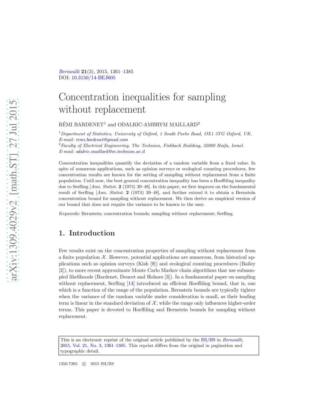 Concentration inequalities quantify the deviation of a random variable from a fixed value. In spite of numerous applications, such as opinion surveys or ecological counting procedures, few concentration results are known for the setting of sampling without replacement from a finite population. Until now, the best general concentration inequality has been a Hoeffding inequality due to Serfling [Ann. Statist. 2 (1974) 39-48]. In this paper, we first improve on the fundamental result of Serfling [Ann. Statist. 2 (1974) 39-48], and further extend it to obtain a Bernstein concentration bound for sampling without replacement. We then derive an empirical version of our bound that does not require the variance to be known to the user.