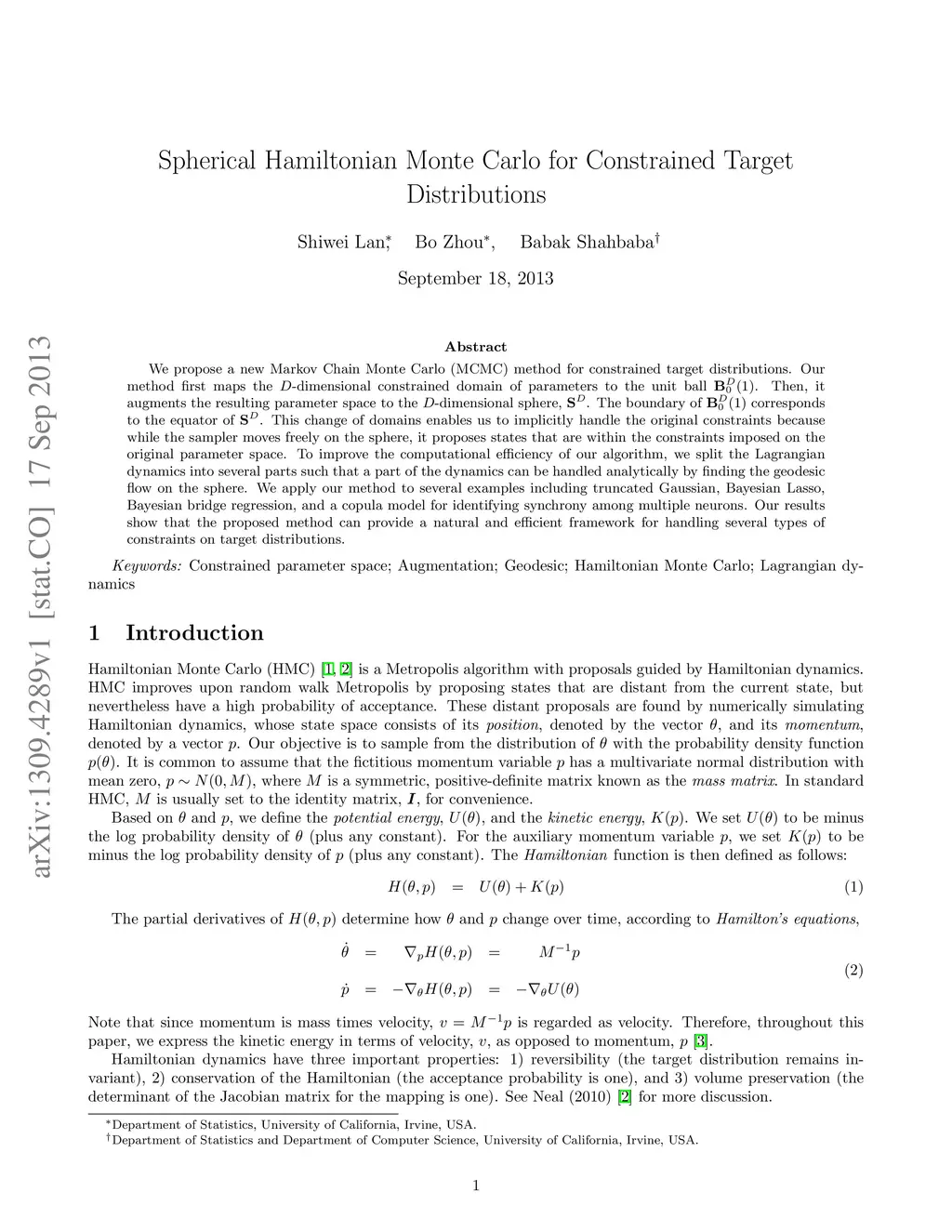 We propose a new Markov Chain Monte Carlo (MCMC) method for constrained target distributions. Our method first maps the -dimensional constrained domain of parameters to the unit ball . Then, it augments the resulting parameter space to the -dimensional sphere, . The boundary of corresponds to the equator of . This change of domains enables us to implicitly handle the original constraints because while the sampler moves freely on the sphere, it proposes states that are within the constraints imposed on the original parameter space. To improve the computational efficiency of our algorithm, we split the Lagrangian dynamics into several parts such that a part of the dynamics can be handled analytically by finding the geodesic flow on the sphere. We apply our method to several examples including truncated Gaussian, Bayesian Lasso, Bayesian bridge regression, and a copula model for identifying synchrony among multiple neurons. Our results show that the proposed method can provide a natural and efficient framework for handling several types of constraints on target distributions.