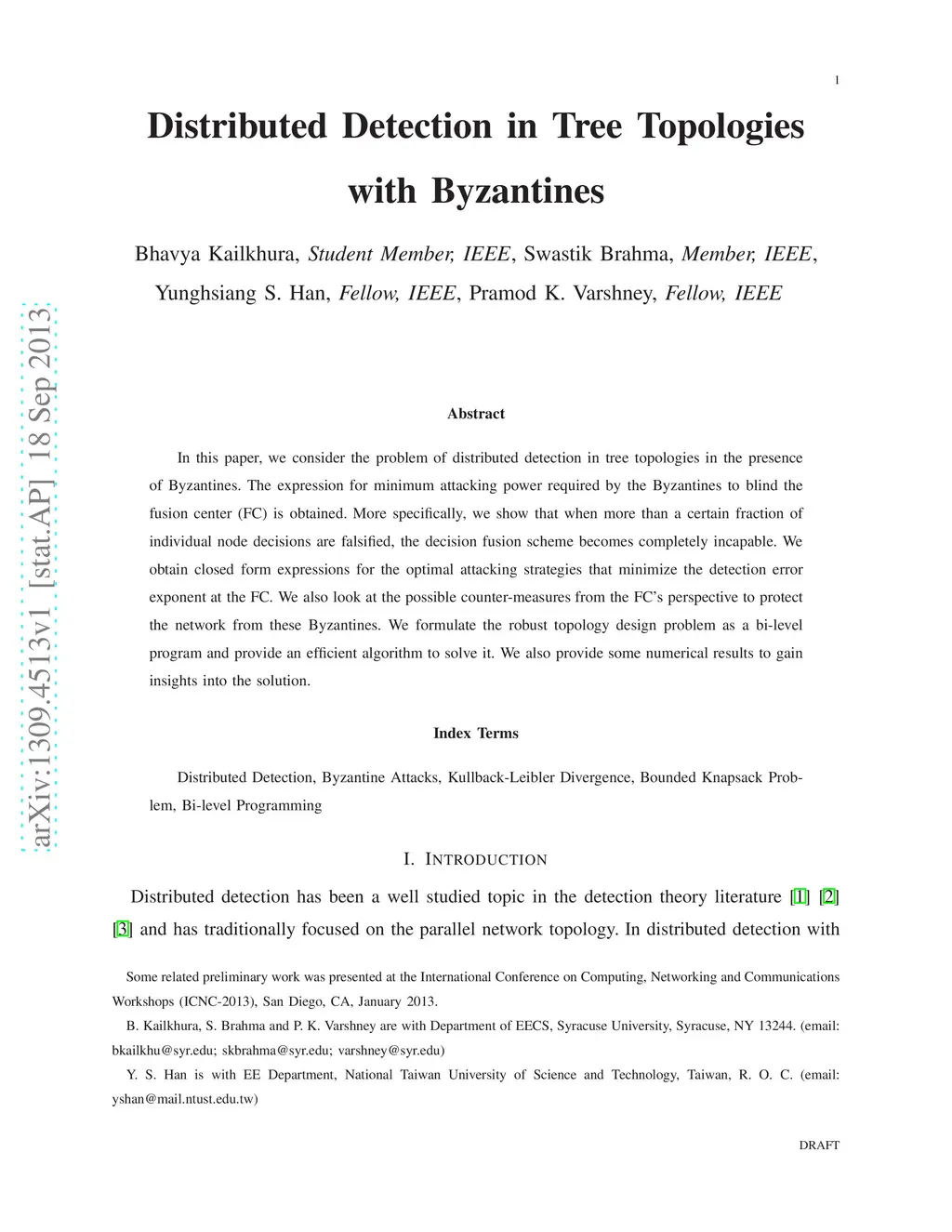 In this paper, we consider the problem of distributed detection in tree topologies in the presence of Byzantines. The expression for minimum attacking power required by the Byzantines to blind the fusion center (FC) is obtained. More specifically, we show that when more than a certain fraction of individual node decisions are falsified, the decision fusion scheme becomes completely incapable. We obtain closed form expressions for the optimal attacking strategies that minimize the detection error exponent at the FC. We also look at the possible counter-measures from the FC's perspective to protect the network from these Byzantines. We formulate the robust topology design problem as a bi-level program and provide an efficient algorithm to solve it. We also provide some numerical results to gain insights into the solution.