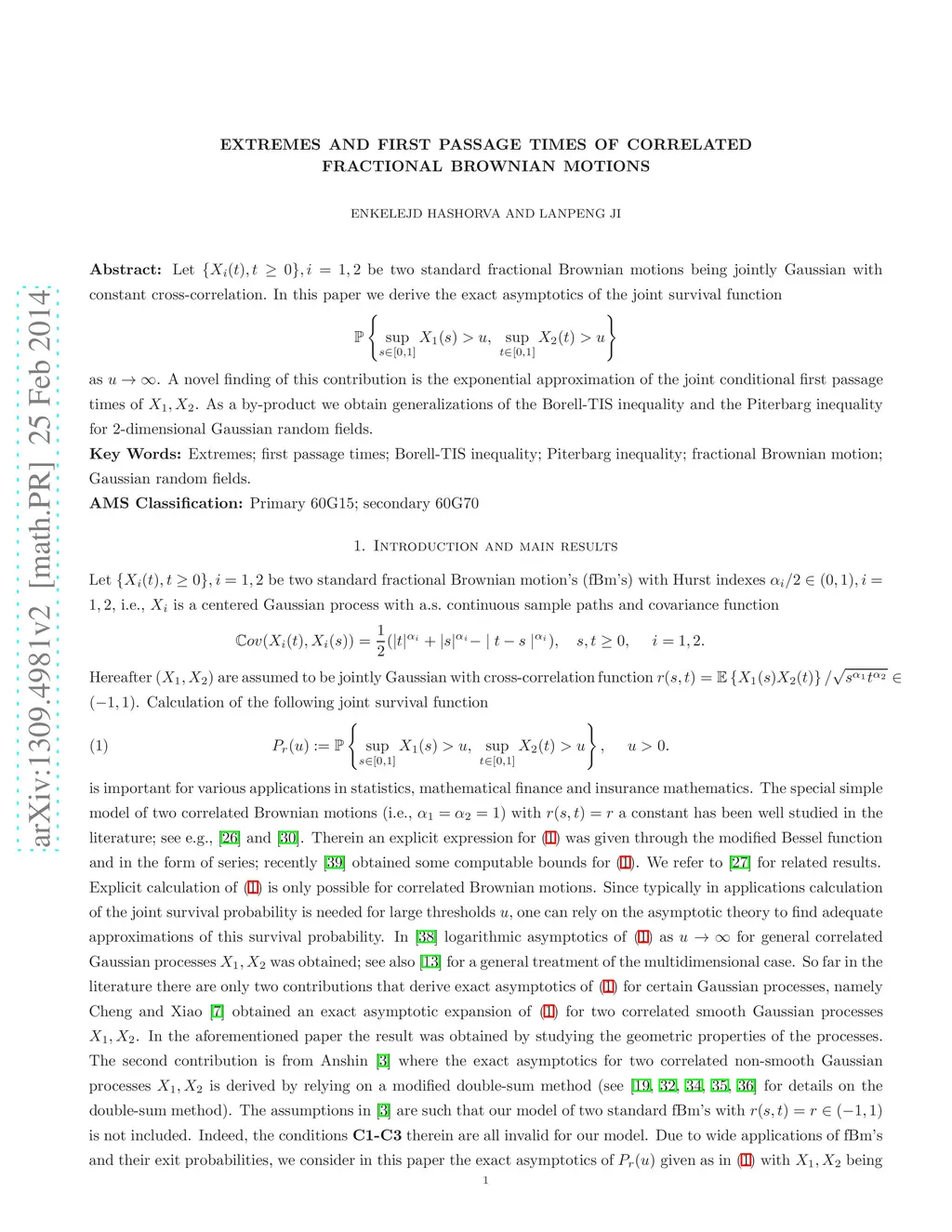 Let be two standard fractional Brownian motions being jointly Gaussian with constant cross-correlation. In this paper we derive the exact asymptotics of the joint survival function as . A novel finding of this contribution is the exponential approximation of the joint conditional first passage times of . As a by-product we obtain generalizations of the Borell-TIS inequality and the Piterbarg inequality for 2-dimensional Gaussian random fields.
