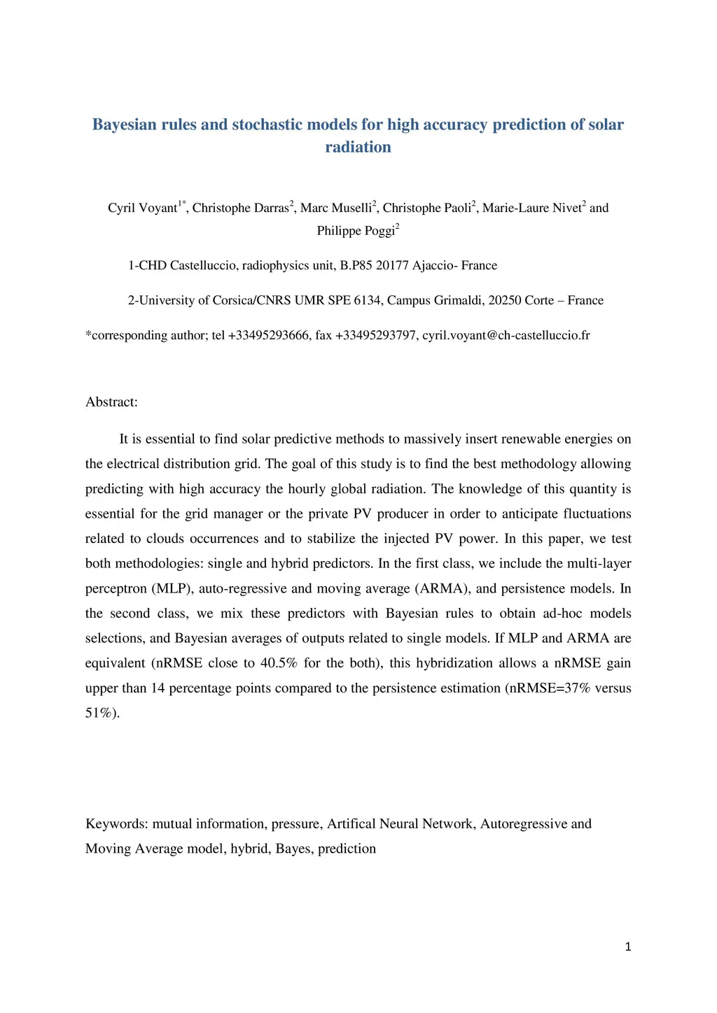 It is essential to find solar predictive methods to massively insert renewable energies on the electrical distribution grid. The goal of this study is to find the best methodology allowing predicting with high accuracy the hourly global radiation. The knowledge of this quantity is essential for the grid manager or the private PV producer in order to anticipate fluctuations related to clouds occurrences and to stabilize the injected PV power. In this paper, we test both methodologies: single and hybrid predictors. In the first class, we include the multi-layer perceptron (MLP), auto-regressive and moving average (ARMA), and persistence models. In the second class, we mix these predictors with Bayesian rules to obtain ad-hoc models selections, and Bayesian averages of outputs related to single models. If MLP and ARMA are equivalent (nRMSE close to 40.5% for the both), this hybridization allows a nRMSE gain upper than 14 percentage points compared to the persistence estimation (nRMSE=37% versus 51%).