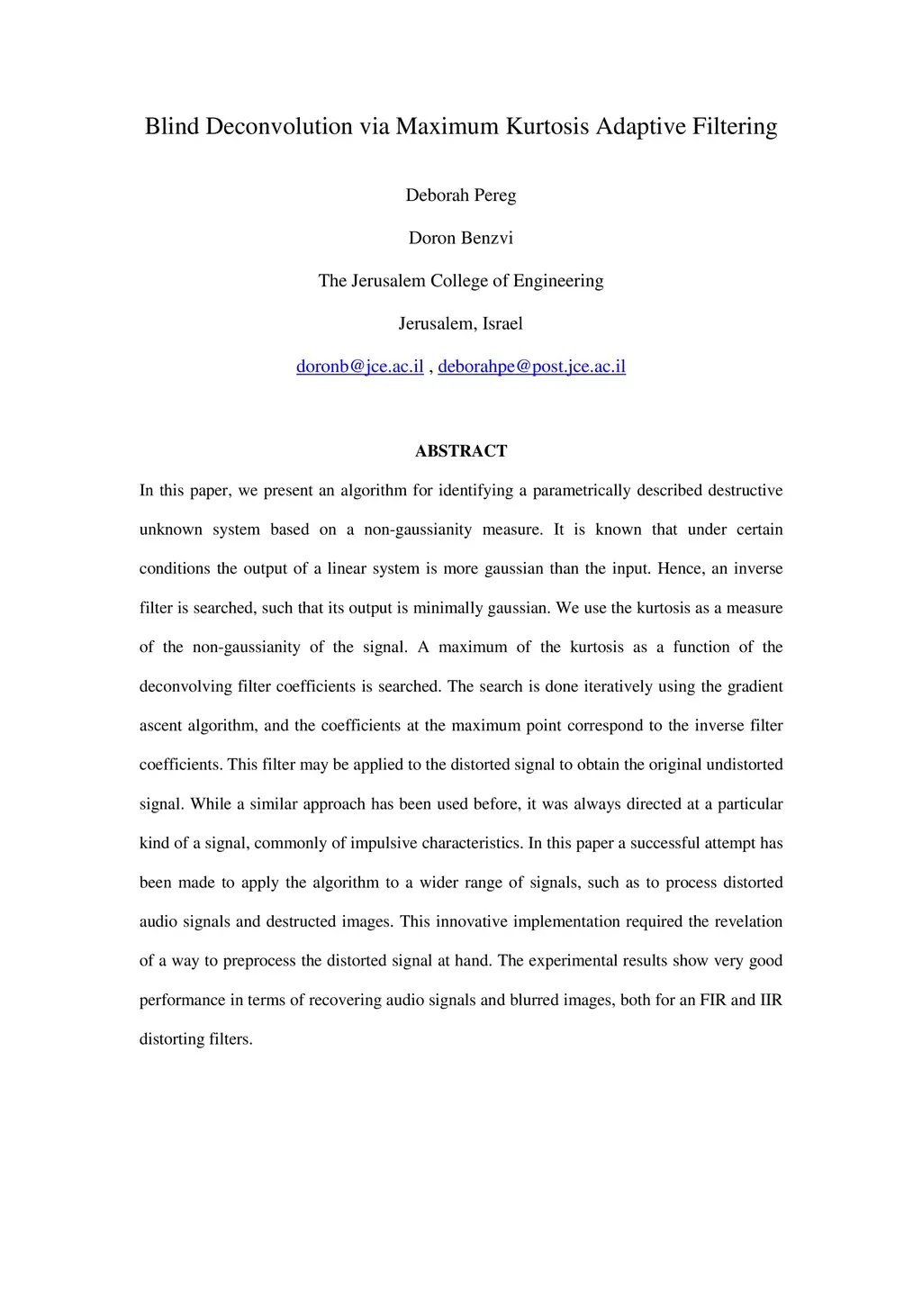 In this paper, we present an algorithm for identifying a parametrically described destructive unknown system based on a non-gaussianity measure. It is known that under certain conditions the output of a linear system is more gaussian than the input. Hence, an inverse filter is searched, such that its output is minimally gaussian. We use the kurtosis as a measure of the non-gaussianity of the signal. A maximum of the kurtosis as a function of the deconvolving filter coefficients is searched. The search is done iteratively using the gradient ascent algorithm, and the coefficients at the maximum point correspond to the inverse filter coefficients. This filter may be applied to the distorted signal to obtain the original undistorted signal. While a similar approach has been used before, it was always directed at a particular kind of a signal, commonly of impulsive characteristics. In this paper a successful attempt has been made to apply the algorithm to a wider range of signals, such as to process distorted audio signals and destructed images. This innovative implementation required the revelation of a way to preprocess the distorted signal at hand. The experimental results show very good performance in terms of recovering audio signals and blurred images, both for an FIR and IIR distorting filters.