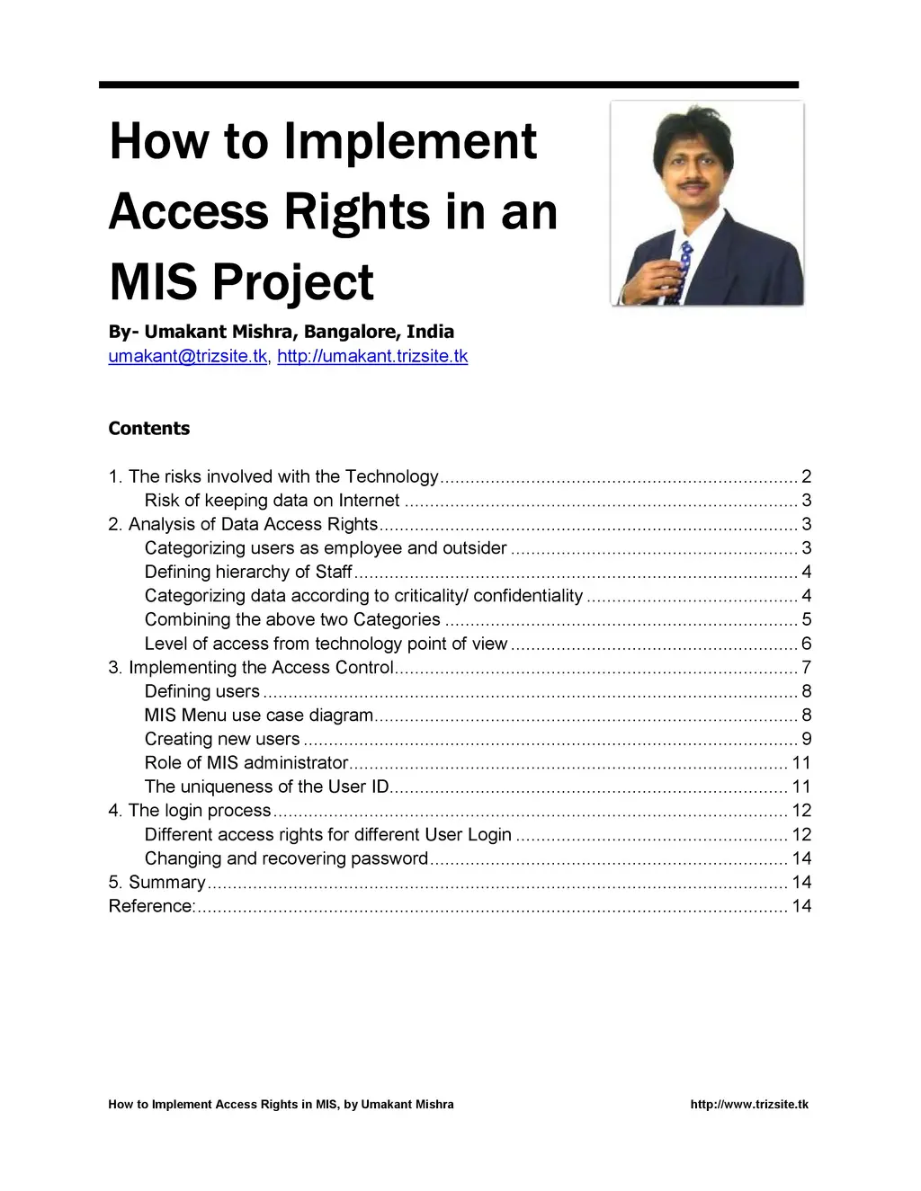 The MIS data is critical to an organization and should be protected from misuse by wrong persons. Although The MIS data is typically meant for the senior managers each MIS report may not be required by every manager. The access to MIS data is determined by the role of an individual in the organization and controlled by the MIS administrator accordingly. The access is generally determined by the following parameters, (a) the type of user (such as staff or manager etc.), (b) the type of data (whether general data or managerial data), (c) level of access (read/ write/ admin access) and (d) special access allocated by MIS admin. By combining all the above four parameters, each individual user can be allocated exact specific rights required to access the MIS.
