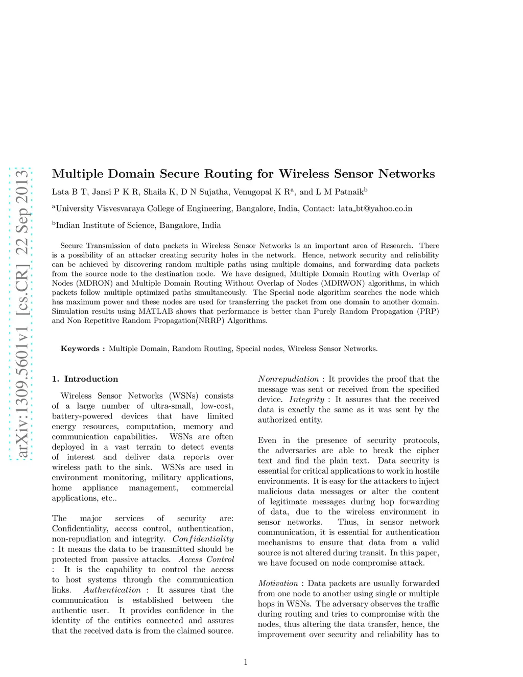 Secure Transmission of data packets in Wireless Sensor Networks is an important area of Research. There is a possibility of an attacker creating security holes in the network. Hence, network security and reliability can be achieved by discovering random multiple paths using multiple domains, and forwarding data packets from the source node to the destination node. We have designed, Multiple Domain Routing with Overlap of Nodes (MDRON) and Multiple Domain Routing Without Overlap of Nodes (MDRWON) algorithms, in which packets follow multiple optimized paths simultaneously. The Special node algorithm searches the node which has maximum power and these nodes are used for transferring the packet from one domain to another domain. Simulation results using MATLAB shows that performance is better than Purely Random Propagation (PRP) and Non Repetitive Random Propagation(NRRP) Algorithms.