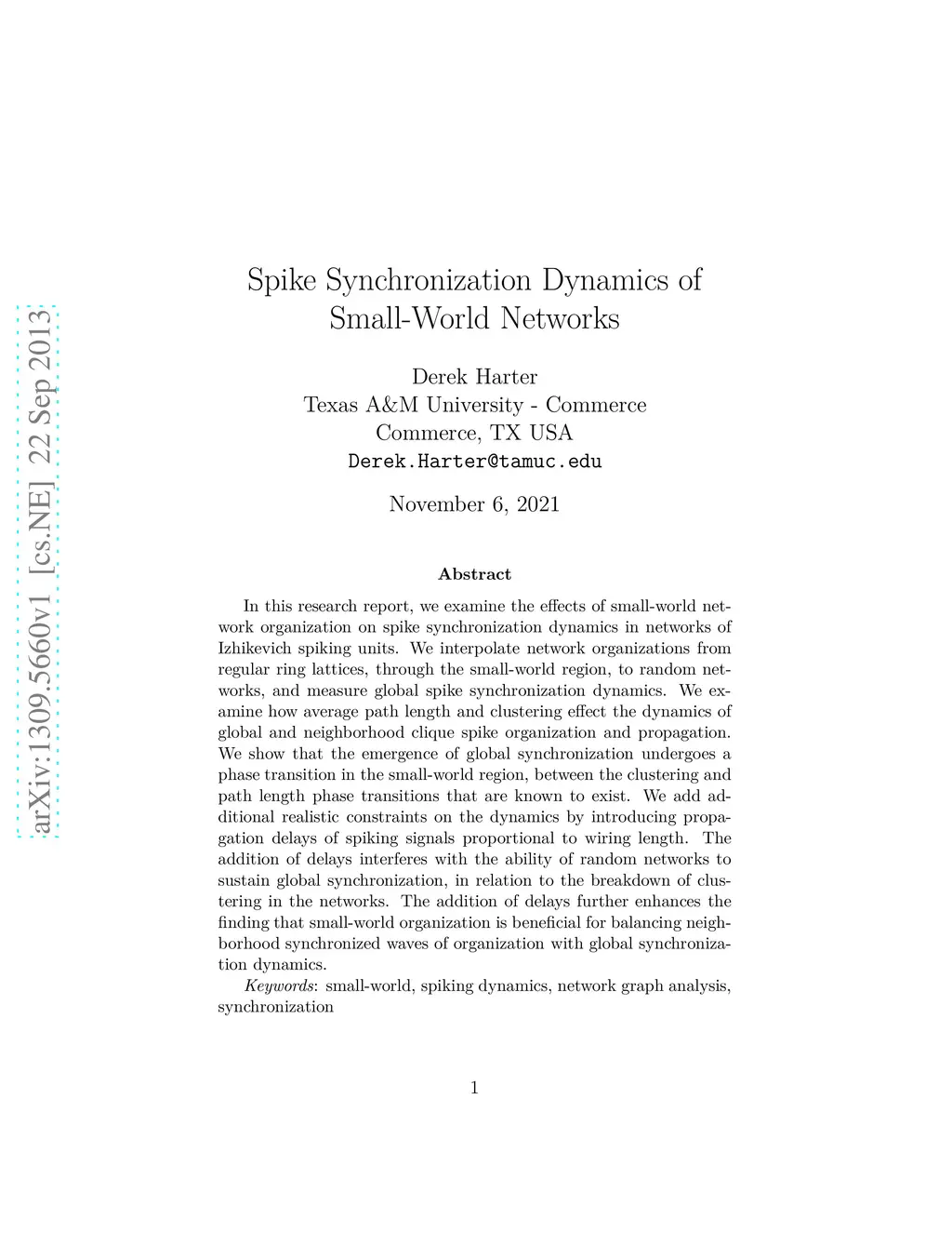 In this research report, we examine the effects of small-world network organization on spike synchronization dynamics in networks of Izhikevich spiking units. We interpolate network organizations from regular ring lattices, through the small-world region, to random networks, and measure global spike synchronization dynamics. We examine how average path length and clustering effect the dynamics of global and neighborhood clique spike organization and propagation. We show that the emergence of global synchronization undergoes a phase transition in the small-world region, between the clustering and path length phase transitions that are known to exist. We add additional realistic constraints on the dynamics by introducing propagation delays of spiking signals proportional to wiring length. The addition of delays interferes with the ability of random networks to sustain global synchronization, in relation to the breakdown of clustering in the networks. The addition of delays further enhances the finding that small-world organization is beneficial for balancing neighborhood synchronized waves of organization with global synchronization dynamics.