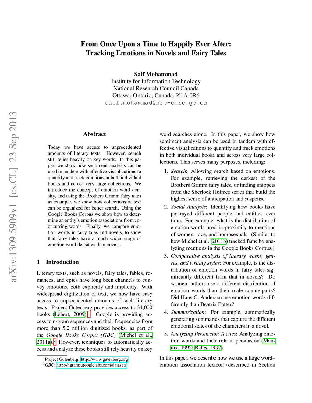Today we have access to unprecedented amounts of literary texts. However, search still relies heavily on key words. In this paper, we show how sentiment analysis can be used in tandem with effective visualizations to quantify and track emotions in both individual books and across very large collections. We introduce the concept of emotion word density, and using the Brothers Grimm fairy tales as example, we show how collections of text can be organized for better search. Using the Google Books Corpus we show how to determine an entity's emotion associations from co-occurring words. Finally, we compare emotion words in fairy tales and novels, to show that fairy tales have a much wider range of emotion word densities than novels.