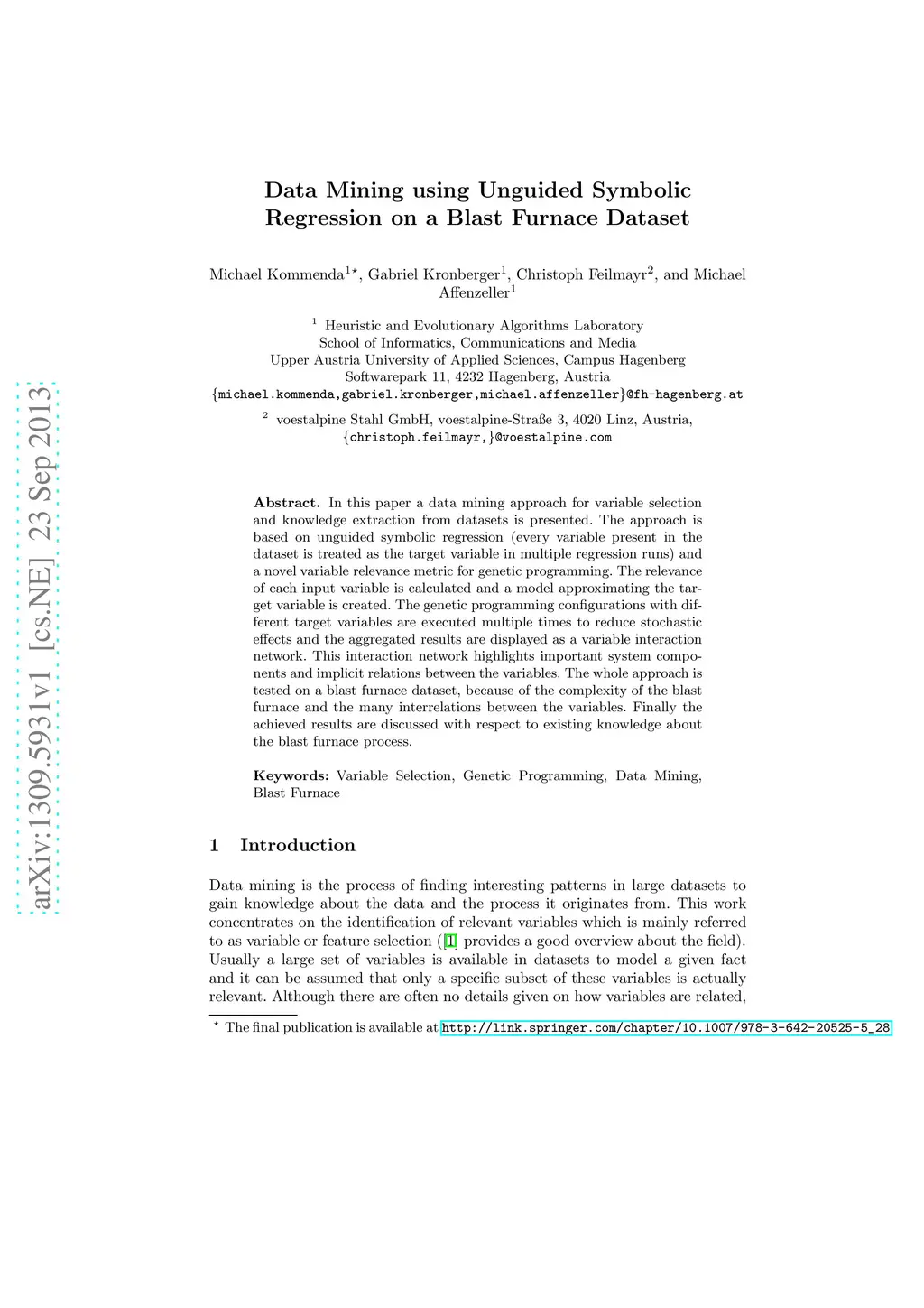 In this paper a data mining approach for variable selection and knowledge extraction from datasets is presented. The approach is based on unguided symbolic regression (every variable present in the dataset is treated as the target variable in multiple regression runs) and a novel variable relevance metric for genetic programming. The relevance of each input variable is calculated and a model approximating the target variable is created. The genetic programming configurations with different target variables are executed multiple times to reduce stochastic effects and the aggregated results are displayed as a variable interaction network. This interaction network highlights important system components and implicit relations between the variables. The whole approach is tested on a blast furnace dataset, because of the complexity of the blast furnace and the many interrelations between the variables. Finally the achieved results are discussed with respect to existing knowledge about the blast furnace process.