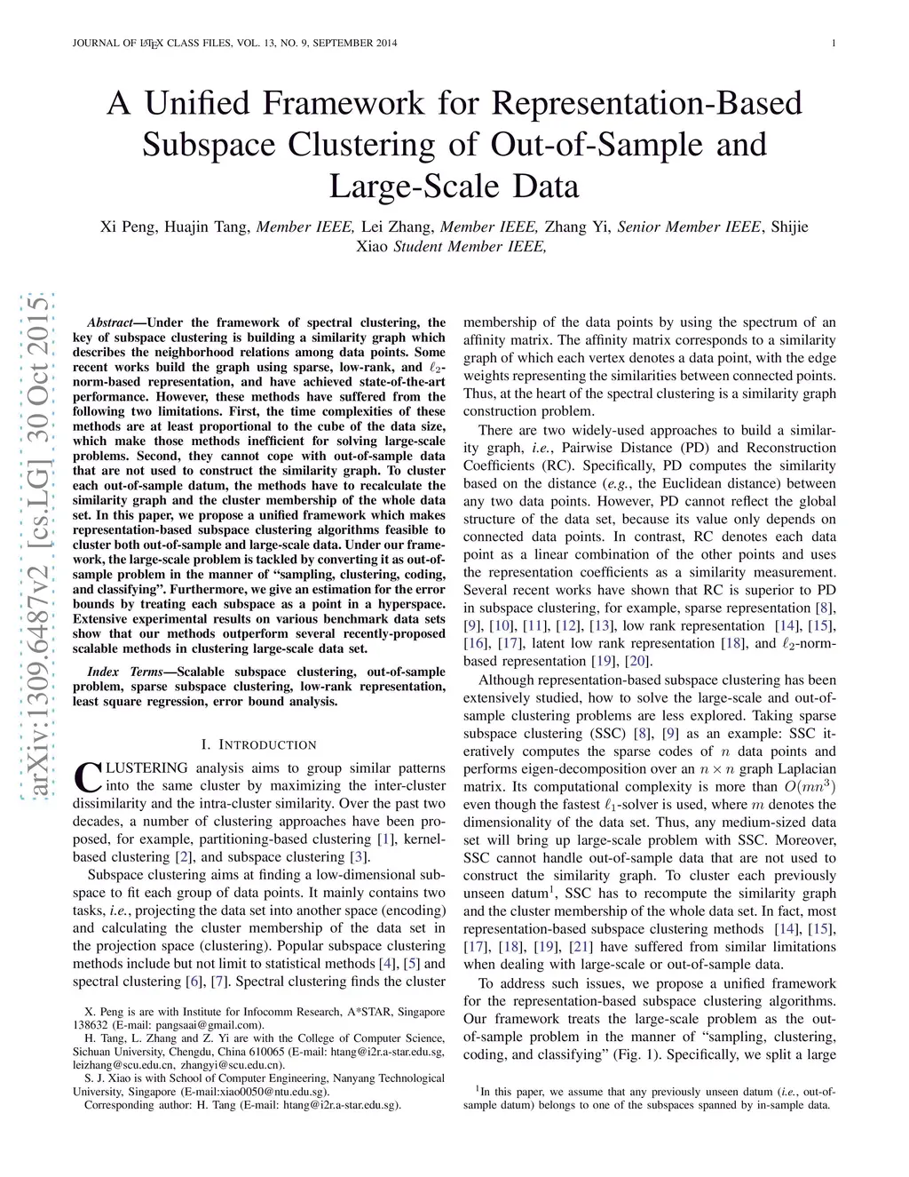 Under the framework of spectral clustering, the key of subspace clustering is building a similarity graph which describes the neighborhood relations among data points. Some recent works build the graph using sparse, low-rank, and -norm-based representation, and have achieved state-of-the-art performance. However, these methods have suffered from the following two limitations. First, the time complexities of these methods are at least proportional to the cube of the data size, which make those methods inefficient for solving large-scale problems. Second, they cannot cope with out-of-sample data that are not used to construct the similarity graph. To cluster each out-of-sample datum, the methods have to recalculate the similarity graph and the cluster membership of the whole data set. In this paper, we propose a unified framework which makes representation-based subspace clustering algorithms feasible to cluster both out-of-sample and large-scale data. Under our framework, the large-scale problem is tackled by converting it as out-of-sample problem in the manner of "sampling, clustering, coding, and classifying". Furthermore, we give an estimation for the error bounds by treating each subspace as a point in a hyperspace. Extensive experimental results on various benchmark data sets show that our methods outperform several recently-proposed scalable methods in clustering large-scale data set.
