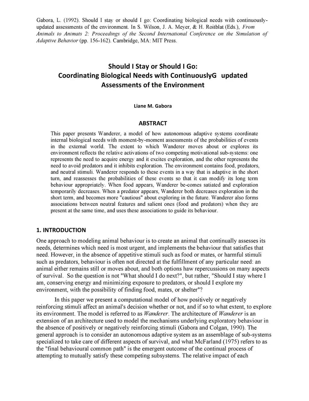 This paper presents Wanderer, a model of how autonomous adaptive systems coordinate internal biological needs with moment-by-moment assessments of the probabilities of events in the external world. The extent to which Wanderer moves about or explores its environment reflects the relative activations of two competing motivational sub-systems: one represents the need to acquire energy and it excites exploration, and the other represents the need to avoid predators and it inhibits exploration. The environment contains food, predators, and neutral stimuli. Wanderer responds to these events in a way that is adaptive in the short turn, and reassesses the probabilities of these events so that it can modify its long term behaviour appropriately. When food appears, Wanderer be-comes satiated and exploration temporarily decreases. When a predator appears, Wanderer both decreases exploration in the short term, and becomes more "cautious" about exploring in the future. Wanderer also forms associations between neutral features and salient ones (food and predators) when they are present at the same time, and uses these associations to guide its behaviour.
