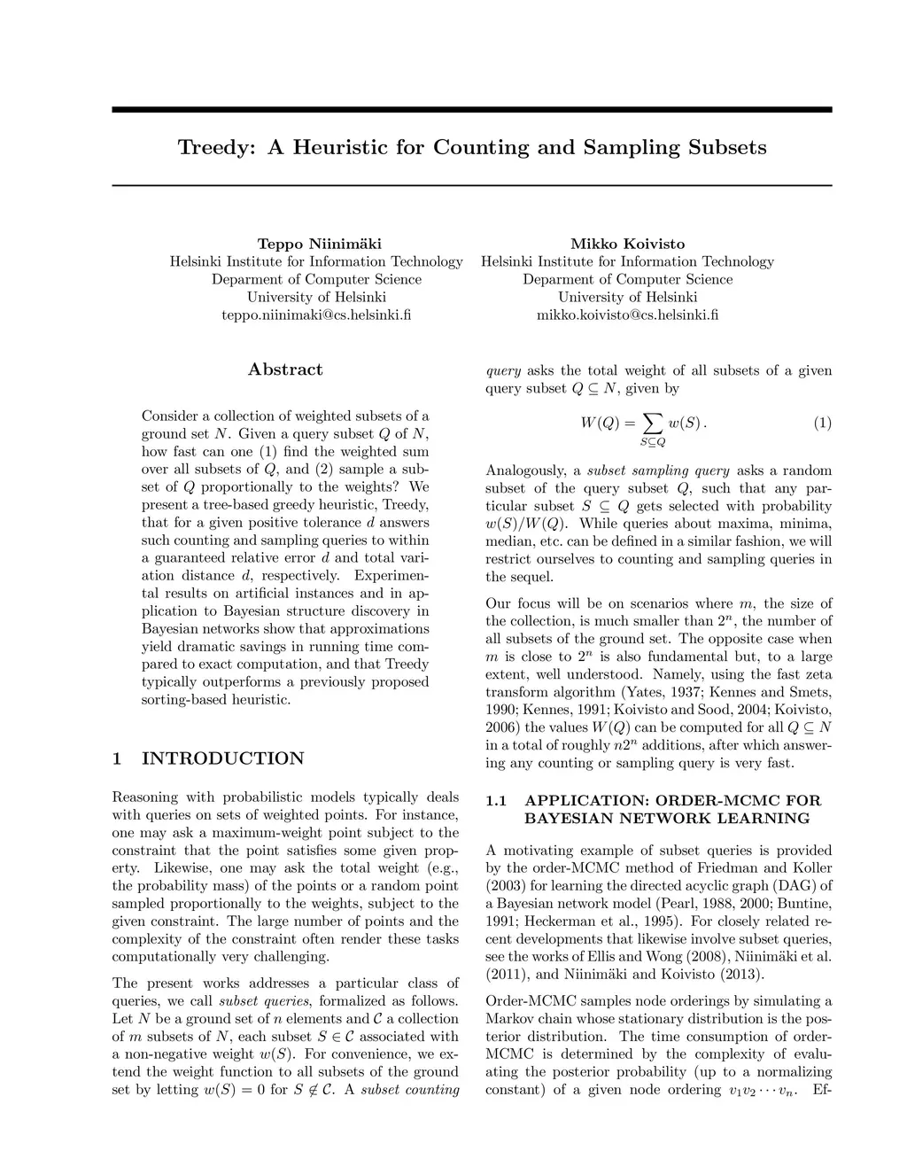 Consider a collection of weighted subsets of a ground set N. Given a query subset Q of N, how fast can one (1) find the weighted sum over all subsets of Q, and (2) sample a subset of Q proportionally to the weights? We present a tree-based greedy heuristic, Treedy, that for a given positive tolerance d answers such counting and sampling queries to within a guaranteed relative error d and total variation distance d, respectively. Experimental results on artificial instances and in application to Bayesian structure discovery in Bayesian networks show that approximations yield dramatic savings in running time compared to exact computation, and that Treedy typically outperforms a previously proposed sorting-based heuristic.