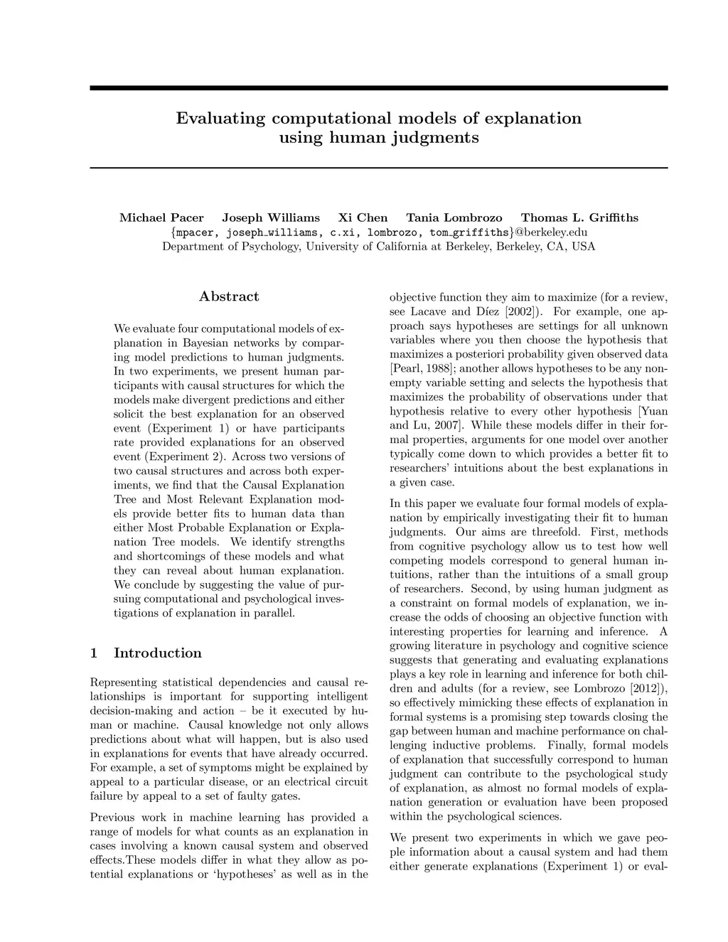 We evaluate four computational models of explanation in Bayesian networks by comparing model predictions to human judgments. In two experiments, we present human participants with causal structures for which the models make divergent predictions and either solicit the best explanation for an observed event (Experiment 1) or have participants rate provided explanations for an observed event (Experiment 2). Across two versions of two causal structures and across both experiments, we find that the Causal Explanation Tree and Most Relevant Explanation models provide better fits to human data than either Most Probable Explanation or Explanation Tree models. We identify strengths and shortcomings of these models and what they can reveal about human explanation. We conclude by suggesting the value of pursuing computational and psychological investigations of explanation in parallel.
