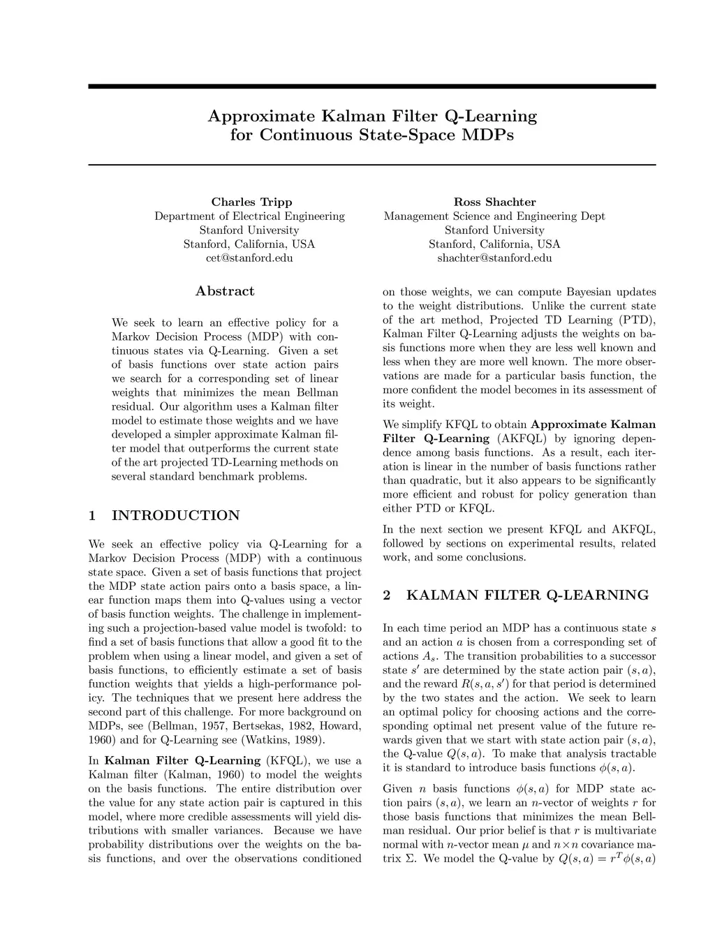 We seek to learn an effective policy for a Markov Decision Process (MDP) with continuous states via Q-Learning. Given a set of basis functions over state action pairs we search for a corresponding set of linear weights that minimizes the mean Bellman residual. Our algorithm uses a Kalman filter model to estimate those weights and we have developed a simpler approximate Kalman filter model that outperforms the current state of the art projected TD-Learning methods on several standard benchmark problems.