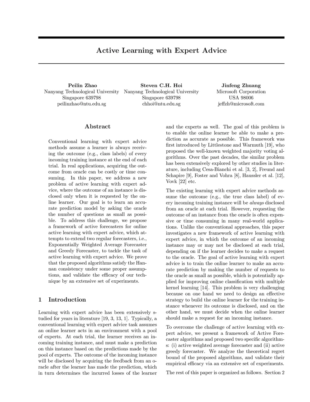 Conventional learning with expert advice methods assumes a learner is always receiving the outcome (e.g., class labels) of every incoming training instance at the end of each trial. In real applications, acquiring the outcome from oracle can be costly or time consuming. In this paper, we address a new problem of active learning with expert advice, where the outcome of an instance is disclosed only when it is requested by the online learner. Our goal is to learn an accurate prediction model by asking the oracle the number of questions as small as possible. To address this challenge, we propose a framework of active forecasters for online active learning with expert advice, which attempts to extend two regular forecasters, i.e., Exponentially Weighted Average Forecaster and Greedy Forecaster, to tackle the task of active learning with expert advice. We prove that the proposed algorithms satisfy the Hannan consistency under some proper assumptions, and validate the efficacy of our technique by an extensive set of experiments.