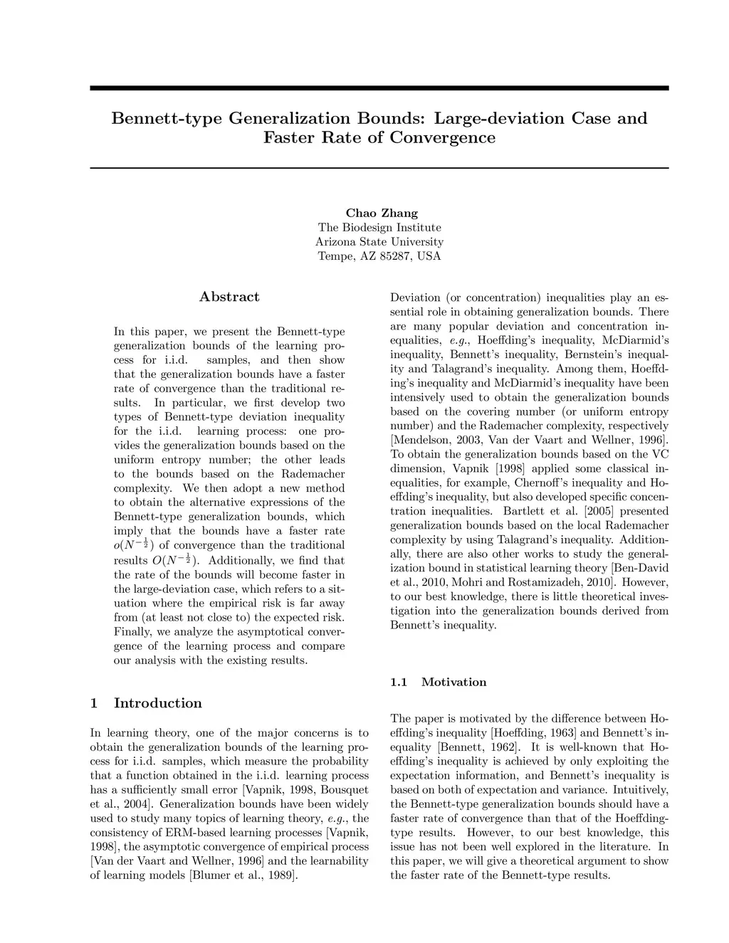 In this paper, we present the Bennett-type generalization bounds of the learning process for i.i.d. samples, and then show that the generalization bounds have a faster rate of convergence than the traditional results. In particular, we first develop two types of Bennett-type deviation inequality for the i.i.d. learning process: one provides the generalization bounds based on the uniform entropy number; the other leads to the bounds based on the Rademacher complexity. We then adopt a new method to obtain the alternative expressions of the Bennett-type generalization bounds, which imply that the bounds have a faster rate o(N^{-1/2}) of convergence than the traditional results O(N^{-1/2}). Additionally, we find that the rate of the bounds will become faster in the large-deviation case, which refers to a situation where the empirical risk is far away from (at least not close to) the expected risk. Finally, we analyze the asymptotical convergence of the learning process and compare our analysis with the existing results.