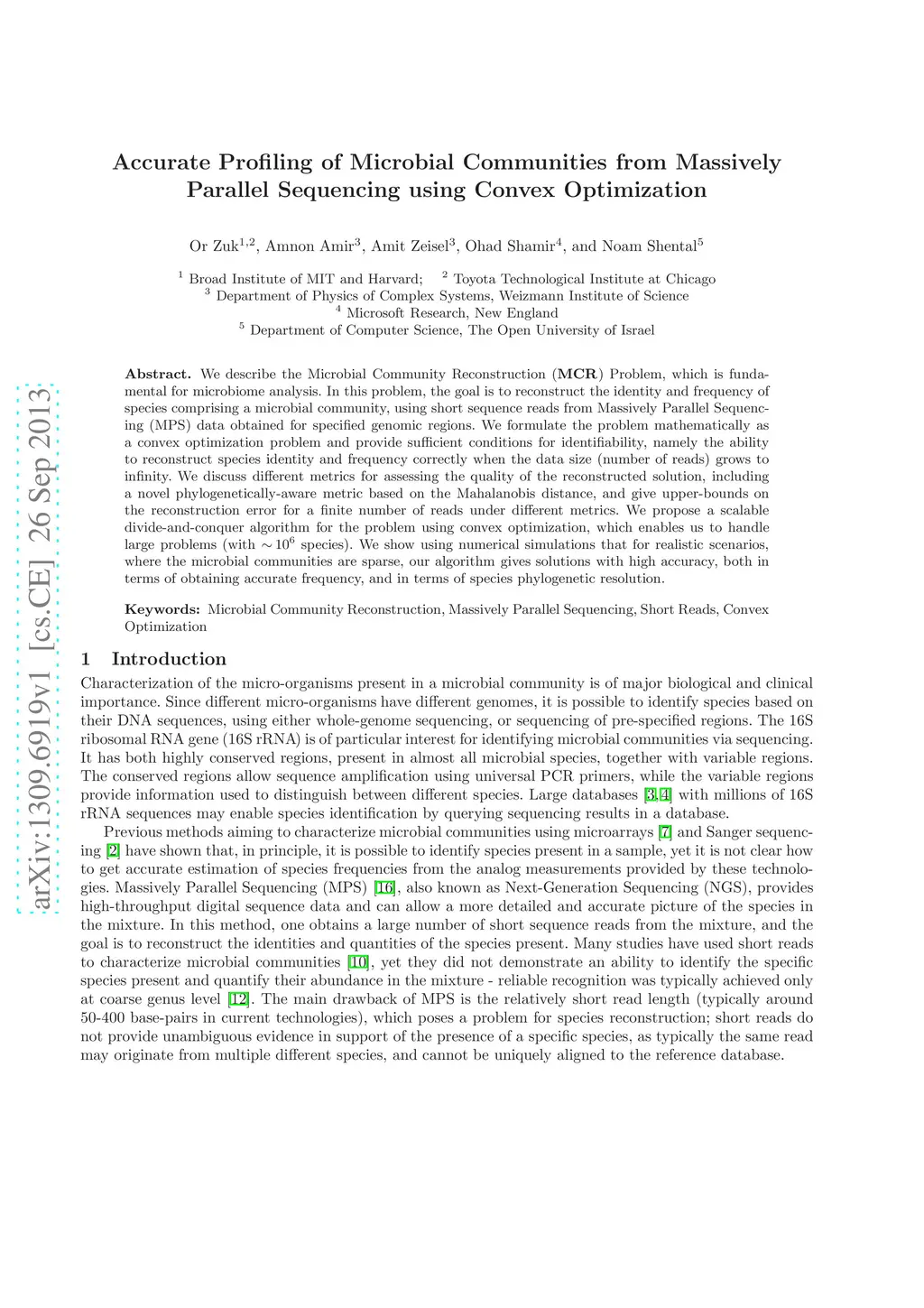 We describe the Microbial Community Reconstruction ({\bf MCR}) Problem, which is fundamental for microbiome analysis. In this problem, the goal is to reconstruct the identity and frequency of species comprising a microbial community, using short sequence reads from Massively Parallel Sequencing (MPS) data obtained for specified genomic regions. We formulate the problem mathematically as a convex optimization problem and provide sufficient conditions for identifiability, namely the ability to reconstruct species identity and frequency correctly when the data size (number of reads) grows to infinity. We discuss different metrics for assessing the quality of the reconstructed solution, including a novel phylogenetically-aware metric based on the Mahalanobis distance, and give upper-bounds on the reconstruction error for a finite number of reads under different metrics. We propose a scalable divide-and-conquer algorithm for the problem using convex optimization, which enables us to handle large problems (with species). We show using numerical simulations that for realistic scenarios, where the microbial communities are sparse, our algorithm gives solutions with high accuracy, both in terms of obtaining accurate frequency, and in terms of species phylogenetic resolution.