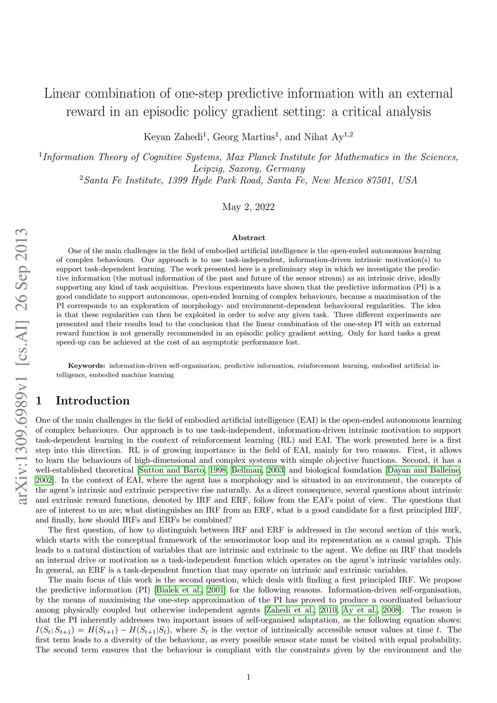 One of the main challenges in the field of embodied artificial intelligence is the open-ended autonomous learning of complex behaviours. Our approach is to use task-independent, information-driven intrinsic motivation(s) to support task-dependent learning. The work presented here is a preliminary step in which we investigate the predictive information (the mutual information of the past and future of the sensor stream) as an intrinsic drive, ideally supporting any kind of task acquisition. Previous experiments have shown that the predictive information (PI) is a good candidate to support autonomous, open-ended learning of complex behaviours, because a maximisation of the PI corresponds to an exploration of morphology- and environment-dependent behavioural regularities. The idea is that these regularities can then be exploited in order to solve any given task. Three different experiments are presented and their results lead to the conclusion that the linear combination of the one-step PI with an external reward function is not generally recommended in an episodic policy gradient setting. Only for hard tasks a great speed-up can be achieved at the cost of an asymptotic performance lost.