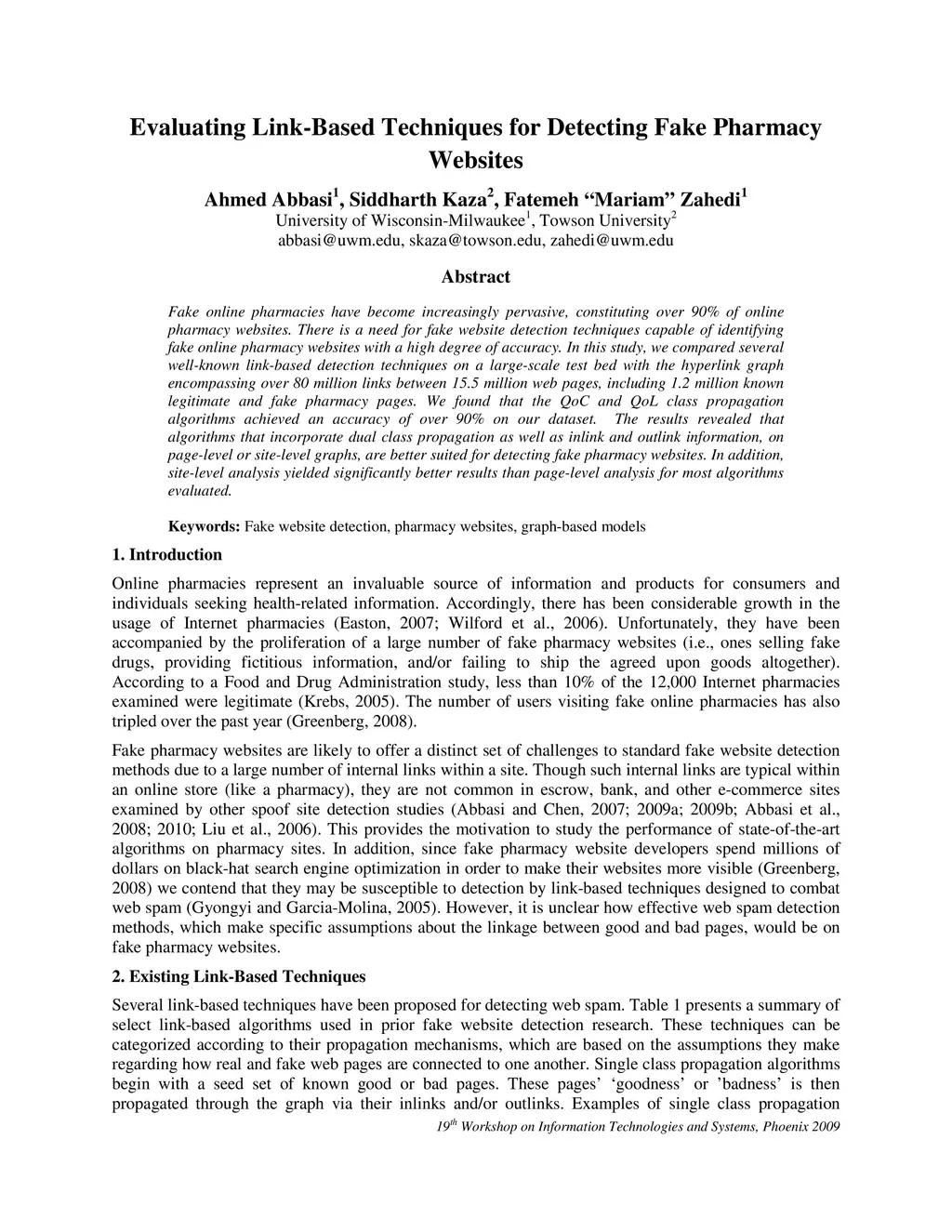 Evaluating Link-Based Techniques for Detecting Fake Pharmacy Websites