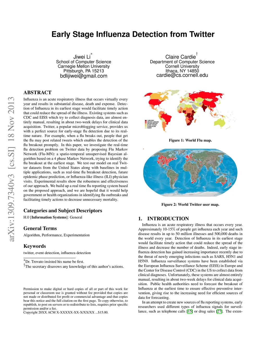 Influenza is an acute respiratory illness that occurs virtually every year and results in substantial disease, death and expense. Detection of Influenza in its earliest stage would facilitate timely action that could reduce the spread of the illness. Existing systems such as CDC and EISS which try to collect diagnosis data, are almost entirely manual, resulting in about two-week delays for clinical data acquisition. Twitter, a popular microblogging service, provides us with a perfect source for early-stage flu detection due to its real- time nature. For example, when a flu breaks out, people that get the flu may post related tweets which enables the detection of the flu breakout promptly. In this paper, we investigate the real-time flu detection problem on Twitter data by proposing Flu Markov Network (Flu-MN): a spatio-temporal unsupervised Bayesian algorithm based on a 4 phase Markov Network, trying to identify the flu breakout at the earliest stage. We test our model on real Twitter datasets from the United States along with baselines in multiple applications, such as real-time flu breakout detection, future epidemic phase prediction, or Influenza-like illness (ILI) physician visits. Experimental results show the robustness and effectiveness of our approach. We build up a real time flu reporting system based on the proposed approach, and we are hopeful that it would help government or health organizations in identifying flu outbreaks and facilitating timely actions to decrease unnecessary mortality.