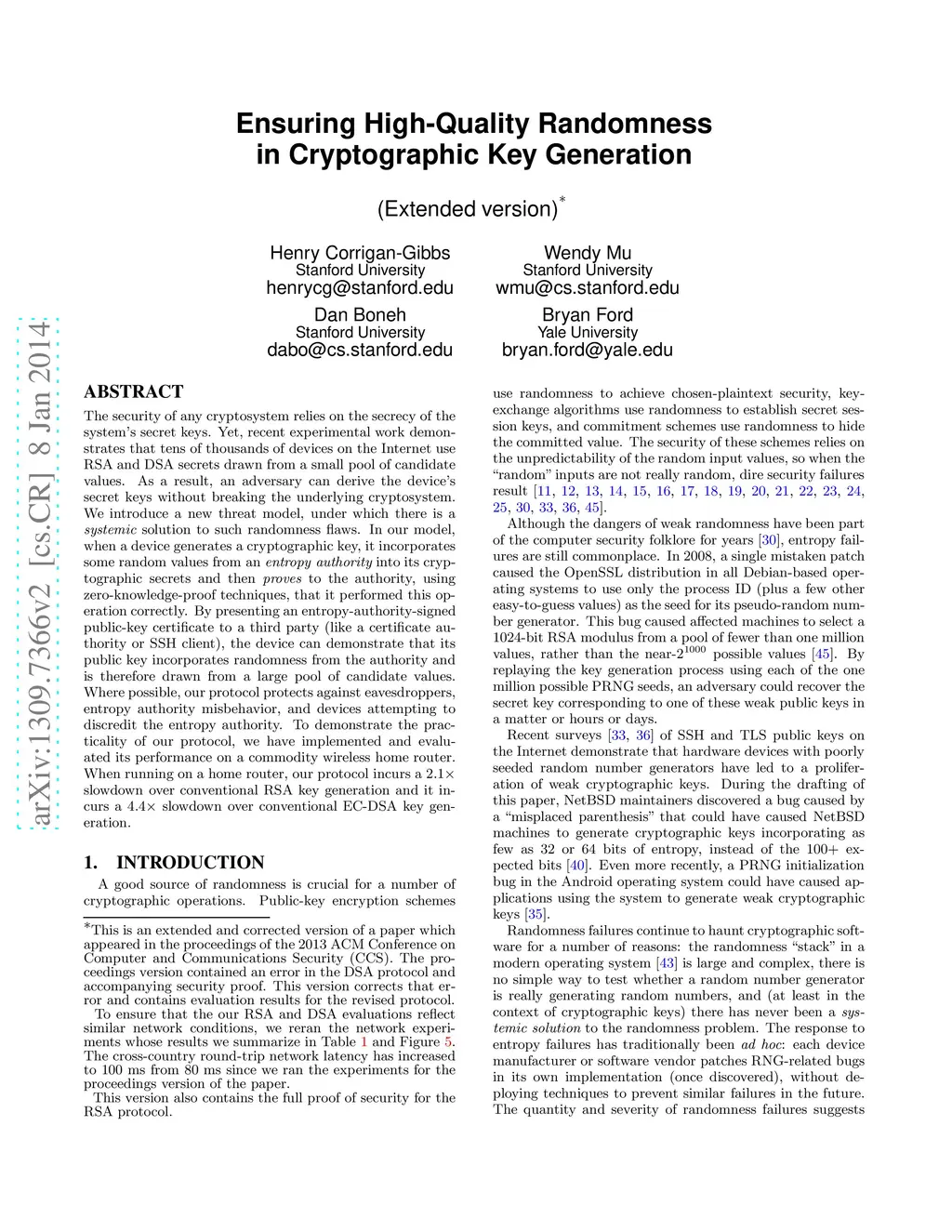 The security of any cryptosystem relies on the secrecy of the system's secret keys. Yet, recent experimental work demonstrates that tens of thousands of devices on the Internet use RSA and DSA secrets drawn from a small pool of candidate values. As a result, an adversary can derive the device's secret keys without breaking the underlying cryptosystem. We introduce a new threat model, under which there is a systemic solution to such randomness flaws. In our model, when a device generates a cryptographic key, it incorporates some random values from an entropy authority into its cryptographic secrets and then proves to the authority, using zero-knowledge-proof techniques, that it performed this operation correctly. By presenting an entropy-authority-signed public-key certificate to a third party (like a certificate authority or SSH client), the device can demonstrate that its public key incorporates randomness from the authority and is therefore drawn from a large pool of candidate values. Where possible, our protocol protects against eavesdroppers, entropy authority misbehavior, and devices attempting to discredit the entropy authority. To demonstrate the practicality of our protocol, we have implemented and evaluated its performance on a commodity wireless home router. When running on a home router, our protocol incurs a 2.1x slowdown over conventional RSA key generation and it incurs a 4.4x slowdown over conventional EC-DSA key generation.