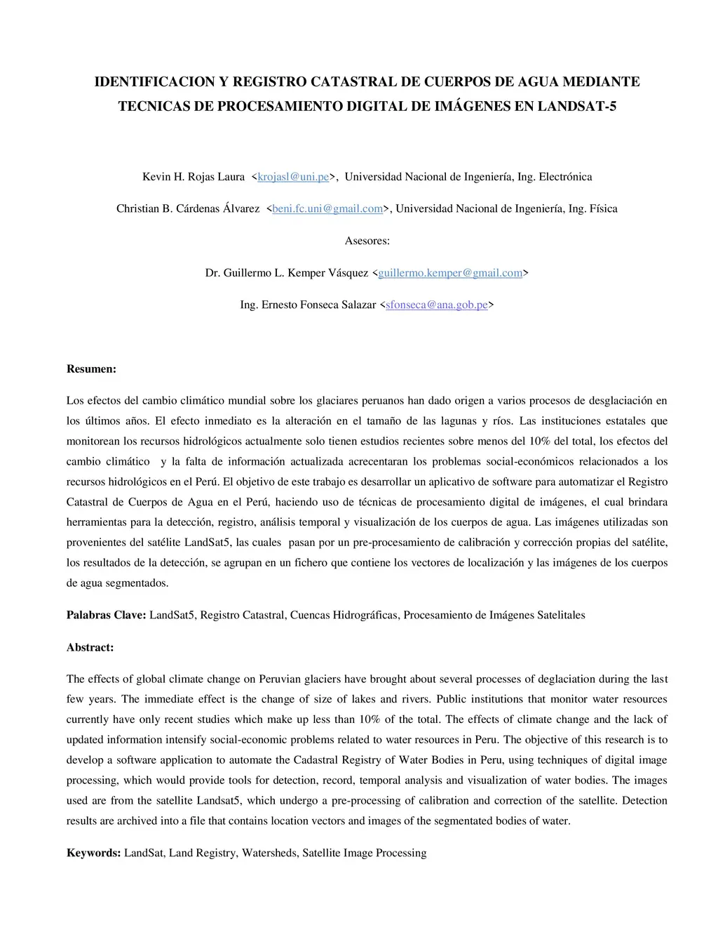 The effects of global climate change on Peruvian glaciers have brought about several processes of deglaciation during the last few years. The immediate effect is the change of size of lakes and rivers. Public institutions that monitor water resources currently have only recent studies which make up less than 10% of the total. The effects of climate change and the lack of updated information intensify social-economic problems related to water resources in Peru. The objective of this research is to develop a software application to automate the Cadastral Registry of Water Bodies in Peru, using techniques of digital image processing, which would provide tools for detection, record, temporal analysis and visualization of water bodies. The images used are from the satellite Landsat5, which undergo a pre-processing of calibration and correction of the satellite. Detection results are archived into a file that contains location vectors and images of the segmentated bodies of water.
