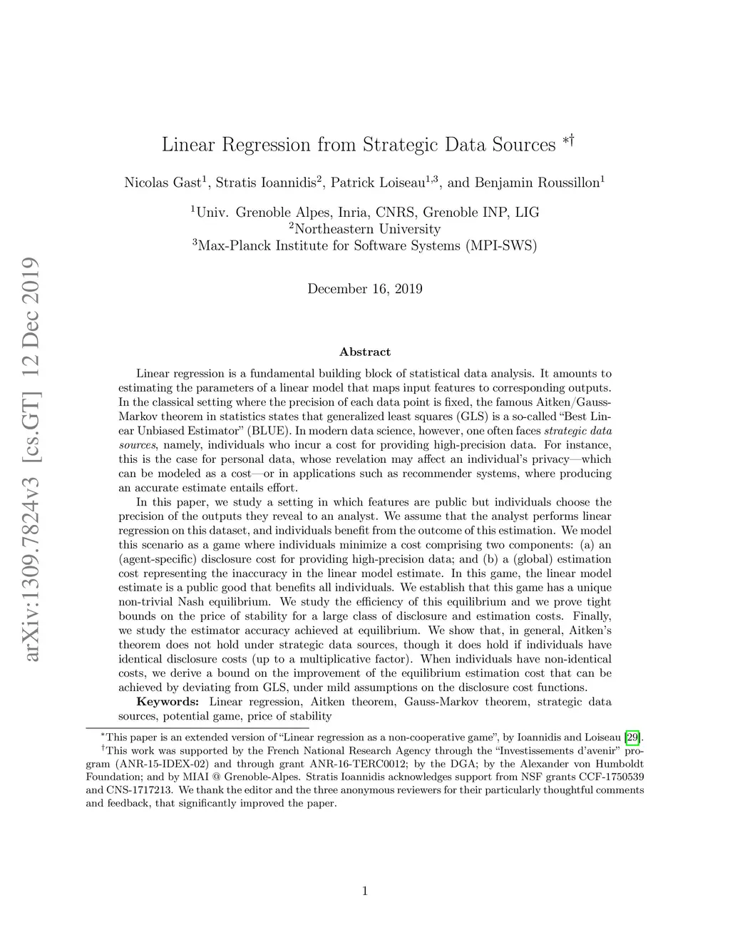 Linear regression is a fundamental building block of statistical data analysis. It amounts to estimating the parameters of a linear model that maps input features to corresponding outputs. In the classical setting where the precision of each data point is fixed, the famous Aitken/Gauss-Markov theorem in statistics states that generalized least squares (GLS) is a so-called "Best Linear Unbiased Estimator" (BLUE). In modern data science, however, one often faces strategic data sources, namely, individuals who incur a cost for providing high-precision data. In this paper, we study a setting in which features are public but individuals choose the precision of the outputs they reveal to an analyst. We assume that the analyst performs linear regression on this dataset, and individuals benefit from the outcome of this estimation. We model this scenario as a game where individuals minimize a cost comprising two components: (a) an (agent-specific) disclosure cost for providing high-precision data; and (b) a (global) estimation cost representing the inaccuracy in the linear model estimate. In this game, the linear model estimate is a public good that benefits all individuals. We establish that this game has a unique non-trivial Nash equilibrium. We study the efficiency of this equilibrium and we prove tight bounds on the price of stability for a large class of disclosure and estimation costs. Finally, we study the estimator accuracy achieved at equilibrium. We show that, in general, Aitken's theorem does not hold under strategic data sources, though it does hold if individuals have identical disclosure costs (up to a multiplicative factor). When individuals have non-identical costs, we derive a bound on the improvement of the equilibrium estimation cost that can be achieved by deviating from GLS, under mild assumptions on the disclosure cost functions.
