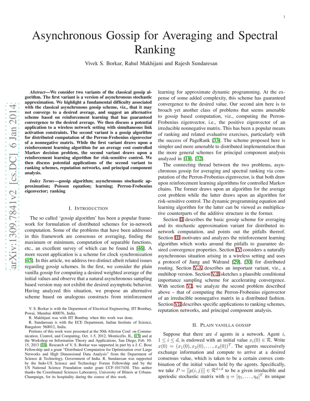 We consider two variants of the classical gossip algorithm. The first variant is a version of asynchronous stochastic approximation. We highlight a fundamental difficulty associated with the classical asynchronous gossip scheme, viz., that it may not converge to a desired average, and suggest an alternative scheme based on reinforcement learning that has guaranteed convergence to the desired average. We then discuss a potential application to a wireless network setting with simultaneous link activation constraints. The second variant is a gossip algorithm for distributed computation of the Perron-Frobenius eigenvector of a nonnegative matrix. While the first variant draws upon a reinforcement learning algorithm for an average cost controlled Markov decision problem, the second variant draws upon a reinforcement learning algorithm for risk-sensitive control. We then discuss potential applications of the second variant to ranking schemes, reputation networks, and principal component analysis.