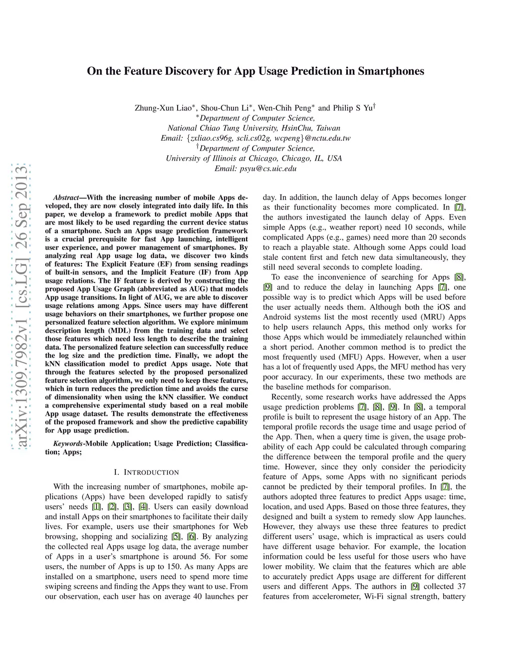 With the increasing number of mobile Apps developed, they are now closely integrated into daily life. In this paper, we develop a framework to predict mobile Apps that are most likely to be used regarding the current device status of a smartphone. Such an Apps usage prediction framework is a crucial prerequisite for fast App launching, intelligent user experience, and power management of smartphones. By analyzing real App usage log data, we discover two kinds of features: The Explicit Feature (EF) from sensing readings of built-in sensors, and the Implicit Feature (IF) from App usage relations. The IF feature is derived by constructing the proposed App Usage Graph (abbreviated as AUG) that models App usage transitions. In light of AUG, we are able to discover usage relations among Apps. Since users may have different usage behaviors on their smartphones, we further propose one personalized feature selection algorithm. We explore minimum description length (MDL) from the training data and select those features which need less length to describe the training data. The personalized feature selection can successfully reduce the log size and the prediction time. Finally, we adopt the kNN classification model to predict Apps usage. Note that through the features selected by the proposed personalized feature selection algorithm, we only need to keep these features, which in turn reduces the prediction time and avoids the curse of dimensionality when using the kNN classifier. We conduct a comprehensive experimental study based on a real mobile App usage dataset. The results demonstrate the effectiveness of the proposed framework and show the predictive capability for App usage prediction.