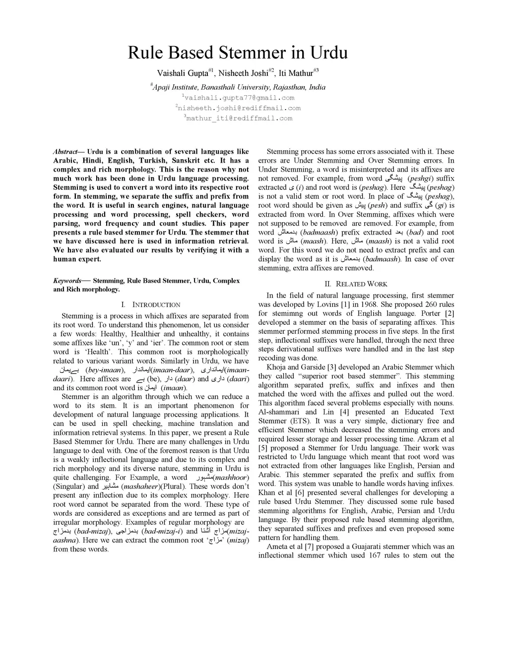 Urdu is a combination of several languages like Arabic, Hindi, English, Turkish, Sanskrit etc. It has a complex and rich morphology. This is the reason why not much work has been done in Urdu language processing. Stemming is used to convert a word into its respective root form. In stemming, we separate the suffix and prefix from the word. It is useful in search engines, natural language processing and word processing, spell checkers, word parsing, word frequency and count studies. This paper presents a rule based stemmer for Urdu. The stemmer that we have discussed here is used in information retrieval. We have also evaluated our results by verifying it with a human expert.