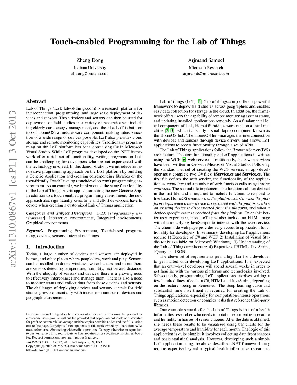Lab of Things (LoT, lab-of-things.com) is a research platform for interconnection, programming, and large scale deployment of devices and sensors. These devices and sensors can then be used for deployment of field studies in a variety of research areas including elderly care, energy management, and the like. LoT is built on top of HomeOS, a middle-ware component, making interconnection of a wide range of devices possible. LoT also provides cloud storage and remote monitoring capabilities. Traditionally programming on the LoT platform has been done using C# in Microsoft Visual Studio. While LoT programs developed on the .NET framework offer a rich set of functionality, writing programs on LoT can be challenging for developers who are not experienced with the technology involved. In this demonstration, we introduce an innovative programming approach on the LoT platform by building a Generic Application and creating corresponding libraries on the user-friendly TouchDevelop (touchdevelop.com) programming environment. As an example, we implemented the same functionality of the Lab of Things Alerts application using the new Generic App. In addition to a touch-enabled programming environment, the new approach also significantly saves time and effort developers have to devote when creating a customized Lab of Things application.
