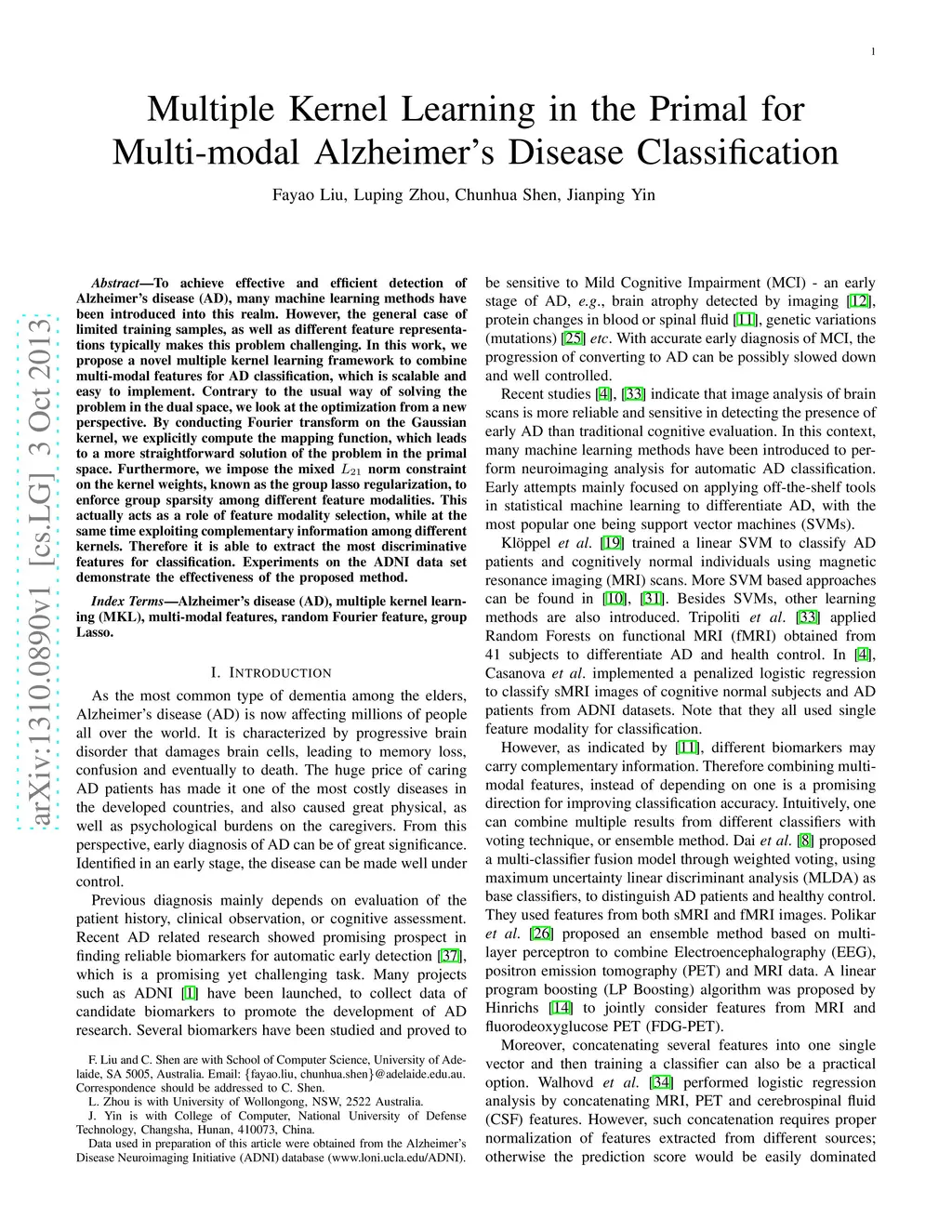 To achieve effective and efficient detection of Alzheimer's disease (AD), many machine learning methods have been introduced into this realm. However, the general case of limited training samples, as well as different feature representations typically makes this problem challenging. In this work, we propose a novel multiple kernel learning framework to combine multi-modal features for AD classification, which is scalable and easy to implement. Contrary to the usual way of solving the problem in the dual space, we look at the optimization from a new perspective. By conducting Fourier transform on the Gaussian kernel, we explicitly compute the mapping function, which leads to a more straightforward solution of the problem in the primal space. Furthermore, we impose the mixed norm constraint on the kernel weights, known as the group lasso regularization, to enforce group sparsity among different feature modalities. This actually acts as a role of feature modality selection, while at the same time exploiting complementary information among different kernels. Therefore it is able to extract the most discriminative features for classification. Experiments on the ADNI data set demonstrate the effectiveness of the proposed method.