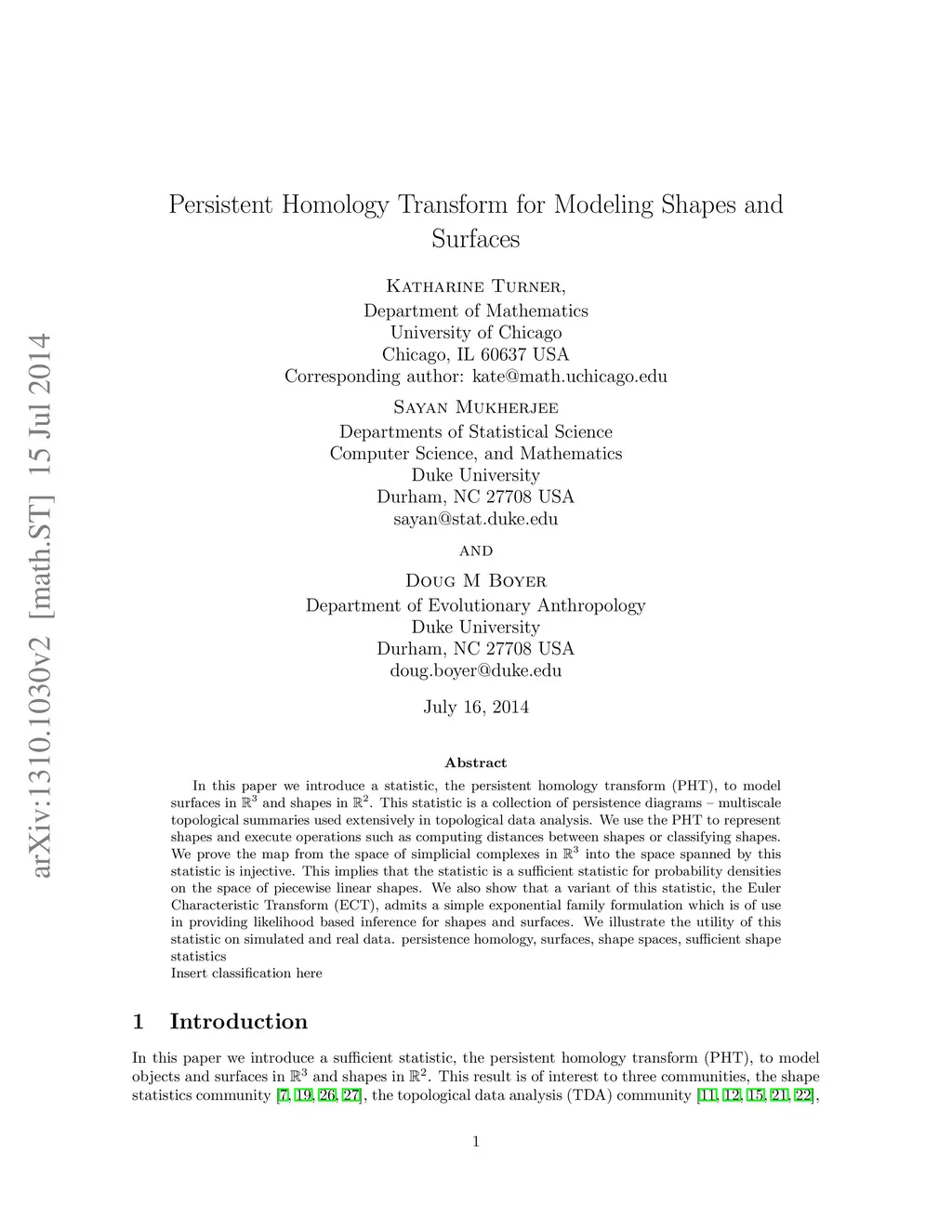 Persistent Homology Transform for Modeling Shapes and Surfaces