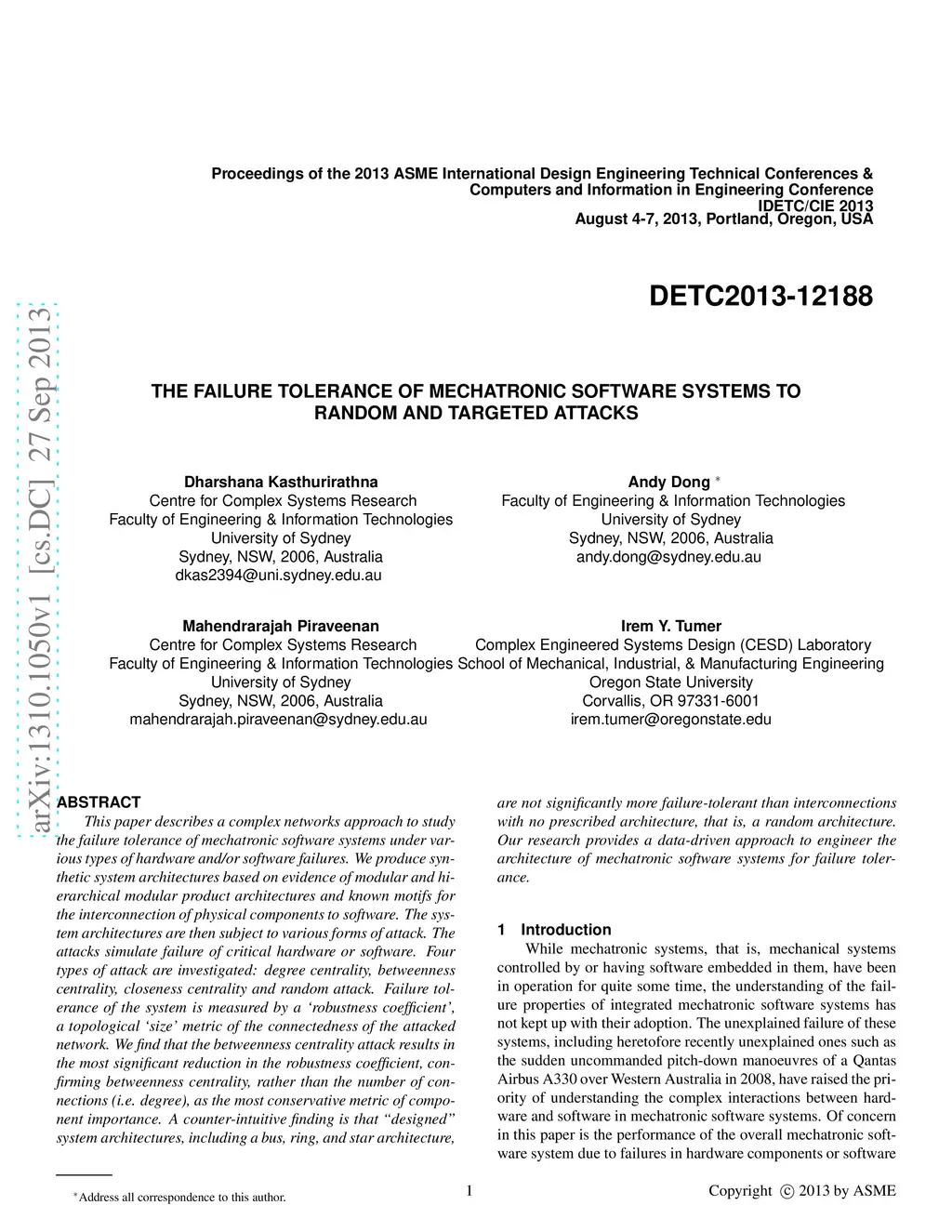 This paper describes a complex networks approach to study the failure tolerance of mechatronic software systems under various types of hardware and/or software failures. We produce synthetic system architectures based on evidence of modular and hierarchical modular product architectures and known motifs for the interconnection of physical components to software. The system architectures are then subject to various forms of attack. The attacks simulate failure of critical hardware or software. Four types of attack are investigated: degree centrality, betweenness centrality, closeness centrality and random attack. Failure tolerance of the system is measured by a 'robustness coefficient', a topological 'size' metric of the connectedness of the attacked network. We find that the betweenness centrality attack results in the most significant reduction in the robustness coefficient, confirming betweenness centrality, rather than the number of connections (i.e. degree), as the most conservative metric of component importance. A counter-intuitive finding is that "designed" system architectures, including a bus, ring, and star architecture, are not significantly more failure-tolerant than interconnections with no prescribed architecture, that is, a random architecture. Our research provides a data-driven approach to engineer the architecture of mechatronic software systems for failure tolerance.