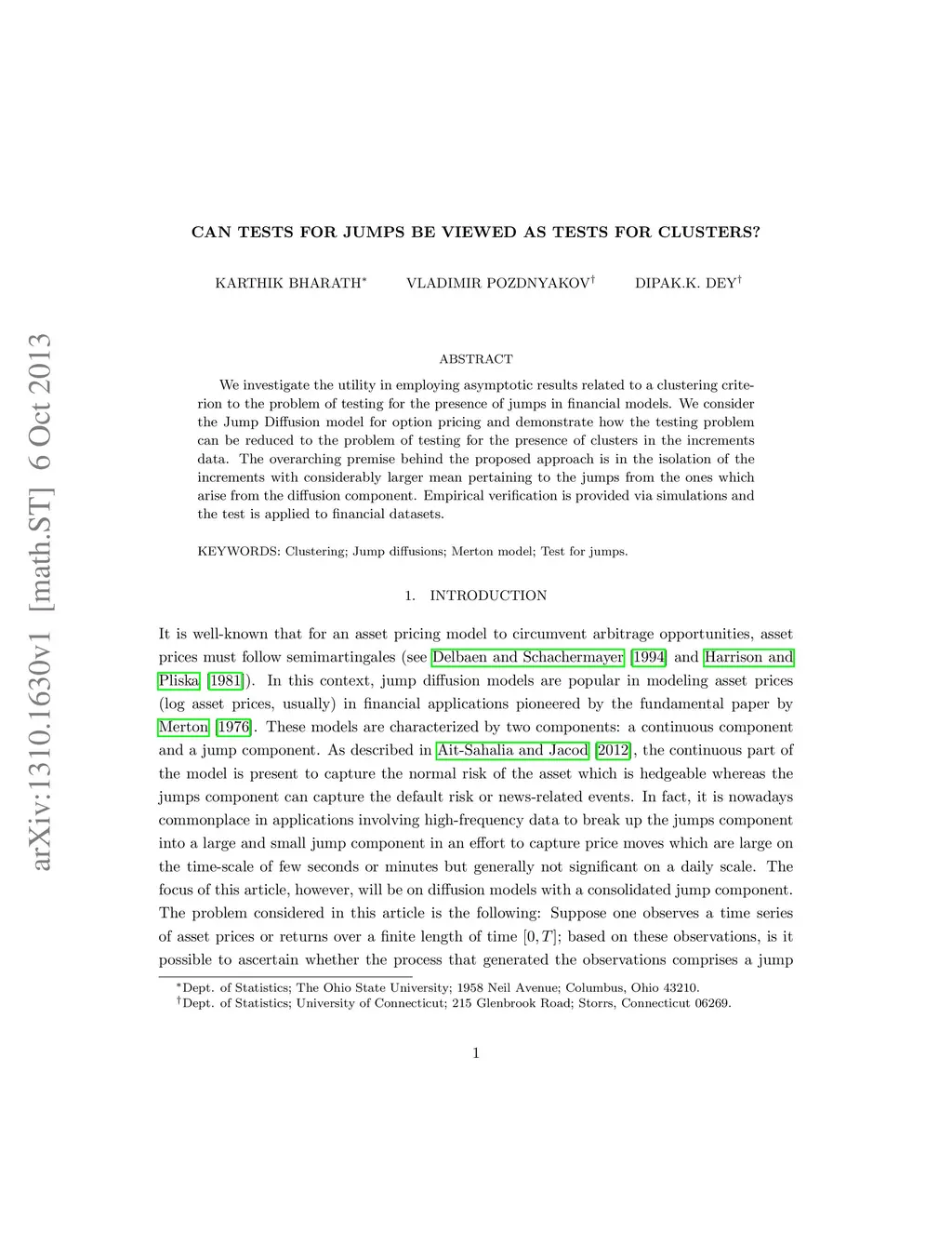 We investigate the utility in employing asymptotic results related to a clustering criterion to the problem of testing for the presence of jumps in financial models. We consider the Jump Diffusion model for option pricing and demonstrate how the testing problem can be reduced to the problem of testing for the presence of clusters in the increments data. The overarching premise behind the proposed approach is in the isolation of the increments with considerably larger mean pertaining to the jumps from the ones which arise from the diffusion component. Empirical verification is provided via simulations and the test is applied to financial datasets.