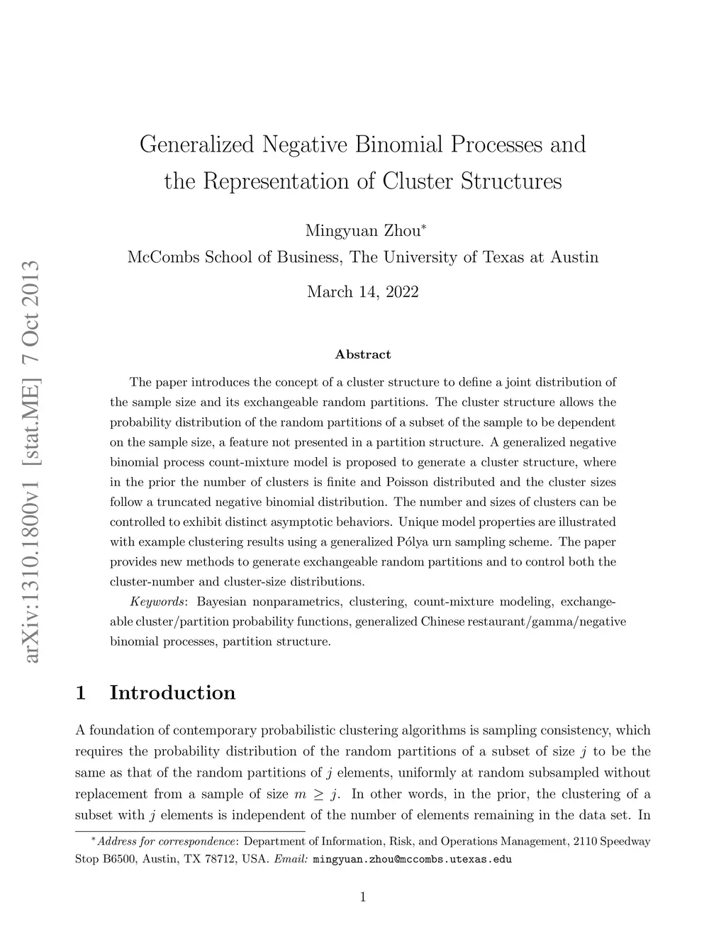 The paper introduces the concept of a cluster structure to define a joint distribution of the sample size and its exchangeable random partitions. The cluster structure allows the probability distribution of the random partitions of a subset of the sample to be dependent on the sample size, a feature not presented in a partition structure. A generalized negative binomial process count-mixture model is proposed to generate a cluster structure, where in the prior the number of clusters is finite and Poisson distributed and the cluster sizes follow a truncated negative binomial distribution. The number and sizes of clusters can be controlled to exhibit distinct asymptotic behaviors. Unique model properties are illustrated with example clustering results using a generalized Polya urn sampling scheme. The paper provides new methods to generate exchangeable random partitions and to control both the cluster-number and cluster-size distributions.