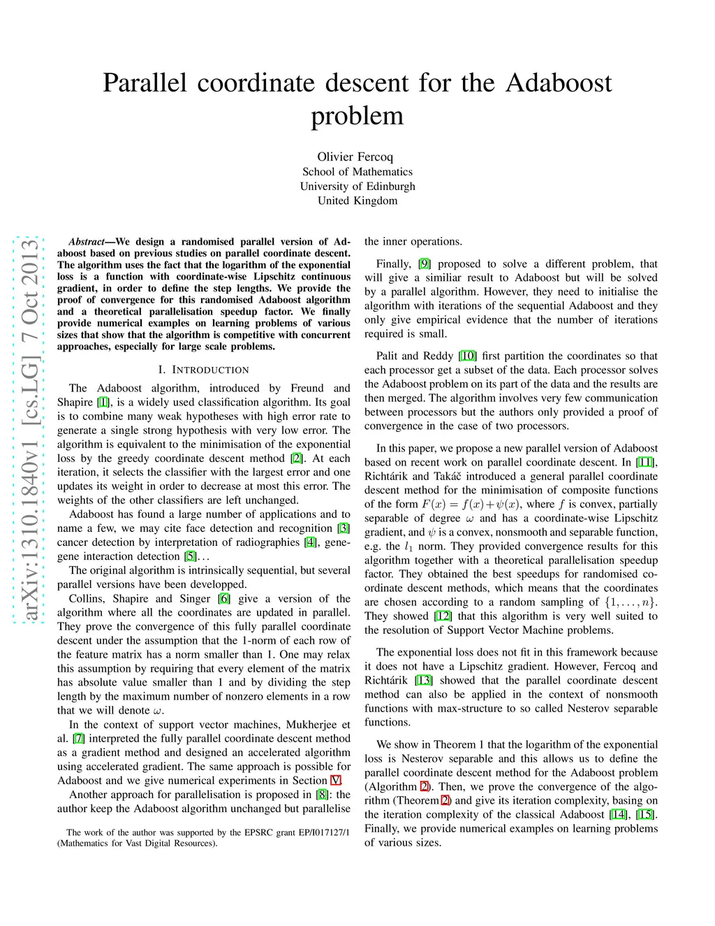 We design a randomised parallel version of Adaboost based on previous studies on parallel coordinate descent. The algorithm uses the fact that the logarithm of the exponential loss is a function with coordinate-wise Lipschitz continuous gradient, in order to define the step lengths. We provide the proof of convergence for this randomised Adaboost algorithm and a theoretical parallelisation speedup factor. We finally provide numerical examples on learning problems of various sizes that show that the algorithm is competitive with concurrent approaches, especially for large scale problems.