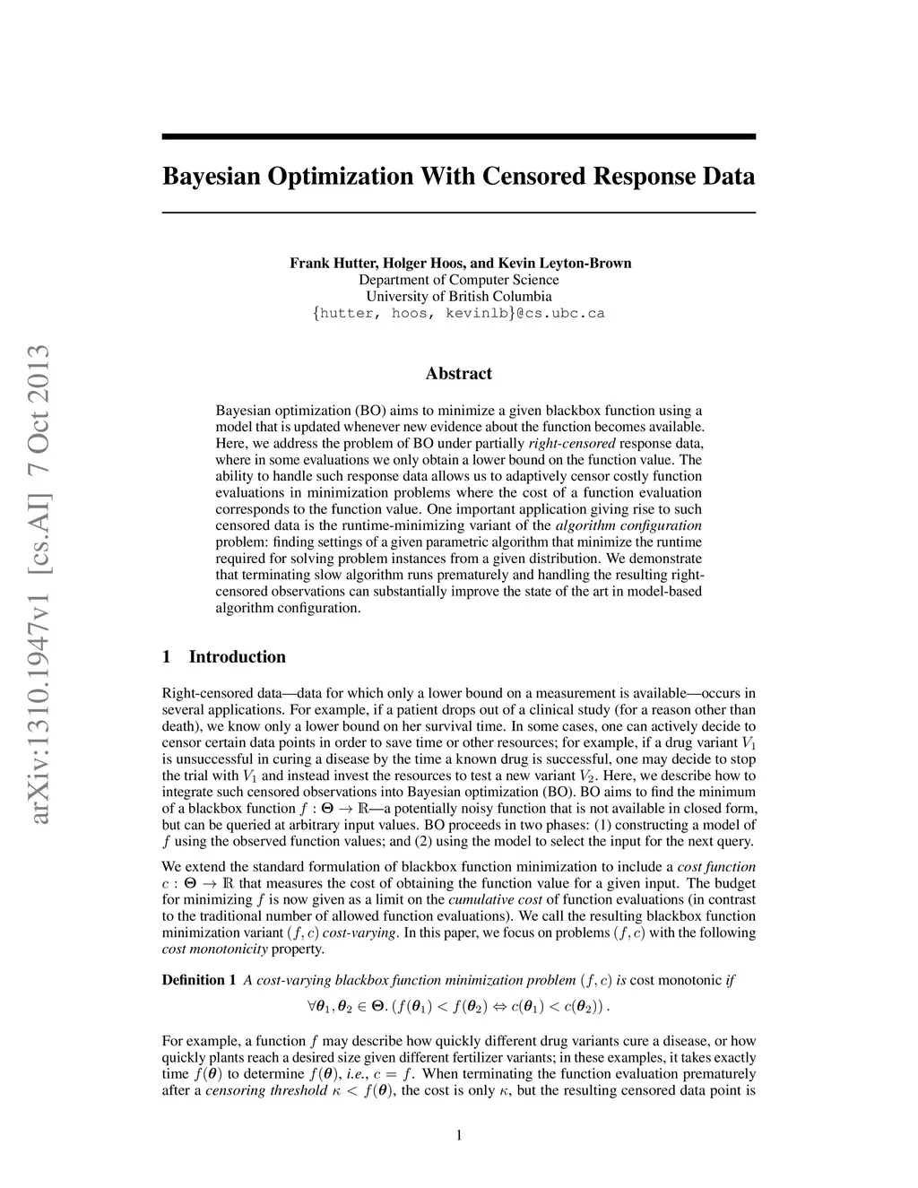 Bayesian optimization (BO) aims to minimize a given blackbox function using a model that is updated whenever new evidence about the function becomes available. Here, we address the problem of BO under partially right-censored response data, where in some evaluations we only obtain a lower bound on the function value. The ability to handle such response data allows us to adaptively censor costly function evaluations in minimization problems where the cost of a function evaluation corresponds to the function value. One important application giving rise to such censored data is the runtime-minimizing variant of the algorithm configuration problem: finding settings of a given parametric algorithm that minimize the runtime required for solving problem instances from a given distribution. We demonstrate that terminating slow algorithm runs prematurely and handling the resulting right-censored observations can substantially improve the state of the art in model-based algorithm configuration.