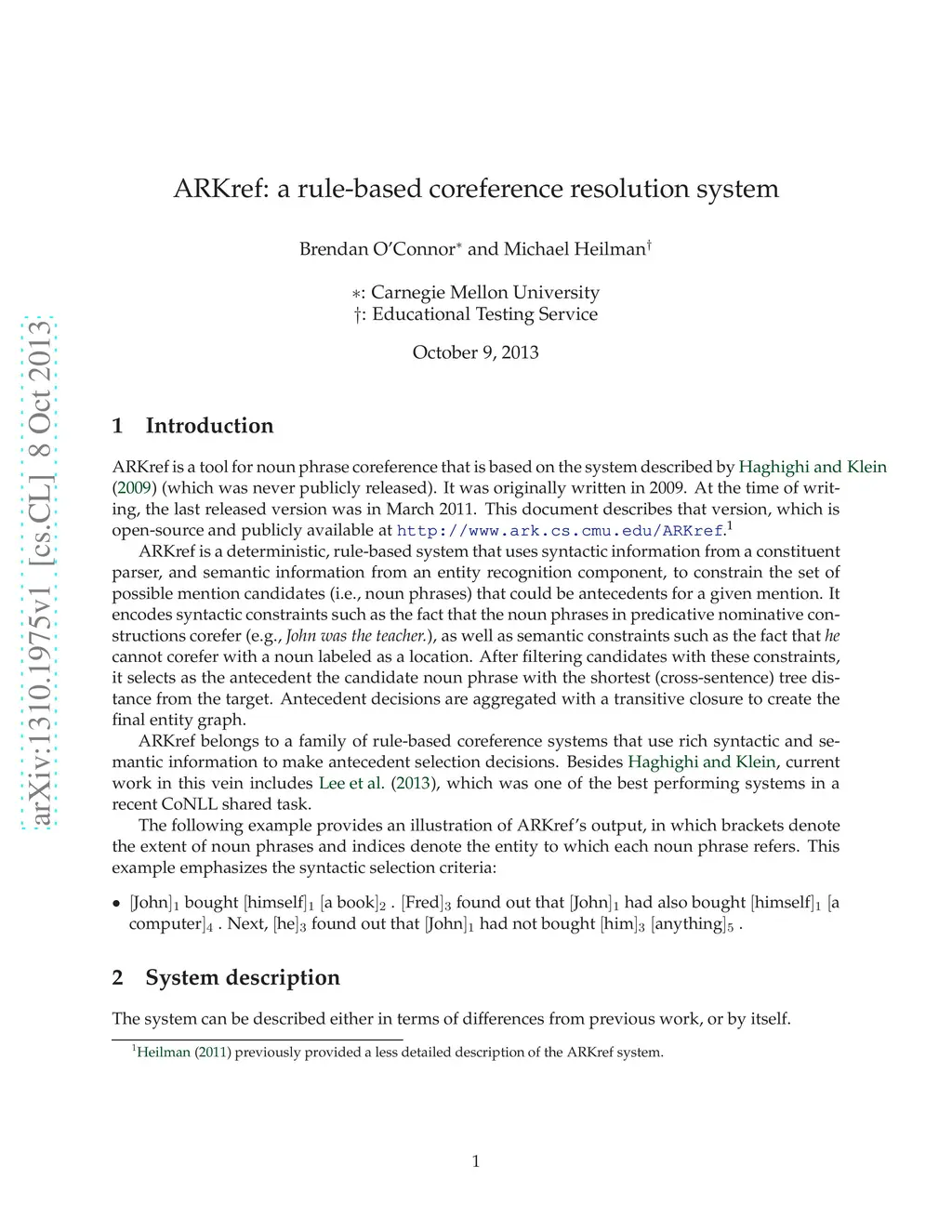 ARKref is a tool for noun phrase coreference. It is a deterministic, rule-based system that uses syntactic information from a constituent parser, and semantic information from an entity recognition component. Its architecture is based on the work of Haghighi and Klein (2009). ARKref was originally written in 2009. At the time of writing, the last released version was in March 2011. This document describes that version, which is open-source and publicly available at: http://www.ark.cs.cmu.edu/ARKref