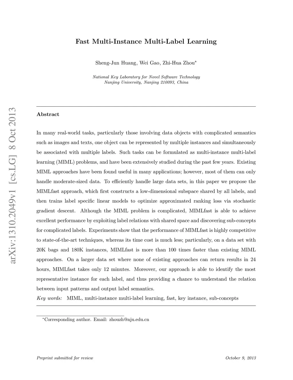 In many real-world tasks, particularly those involving data objects with complicated semantics such as images and texts, one object can be represented by multiple instances and simultaneously be associated with multiple labels. Such tasks can be formulated as multi-instance multi-label learning (MIML) problems, and have been extensively studied during the past few years. Existing MIML approaches have been found useful in many applications; however, most of them can only handle moderate-sized data. To efficiently handle large data sets, in this paper we propose the MIMLfast approach, which first constructs a low-dimensional subspace shared by all labels, and then trains label specific linear models to optimize approximated ranking loss via stochastic gradient descent. Although the MIML problem is complicated, MIMLfast is able to achieve excellent performance by exploiting label relations with shared space and discovering sub-concepts for complicated labels. Experiments show that the performance of MIMLfast is highly competitive to state-of-the-art techniques, whereas its time cost is much less; particularly, on a data set with 20K bags and 180K instances, MIMLfast is more than 100 times faster than existing MIML approaches. On a larger data set where none of existing approaches can return results in 24 hours, MIMLfast takes only 12 minutes. Moreover, our approach is able to identify the most representative instance for each label, and thus providing a chance to understand the relation between input patterns and output label semantics.